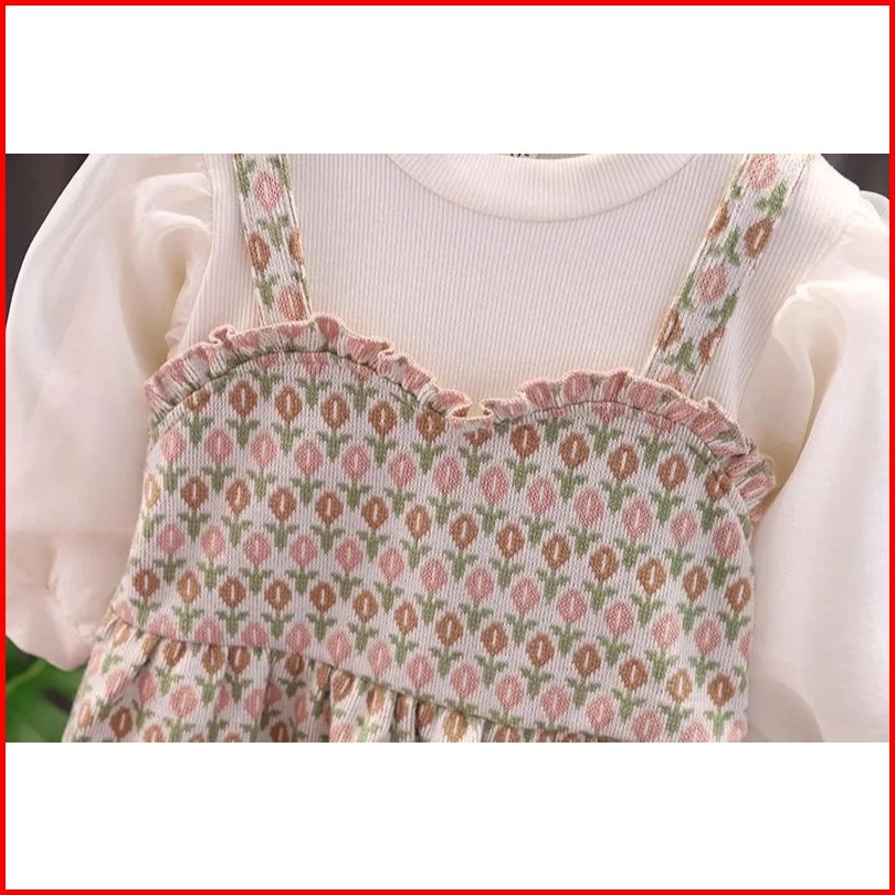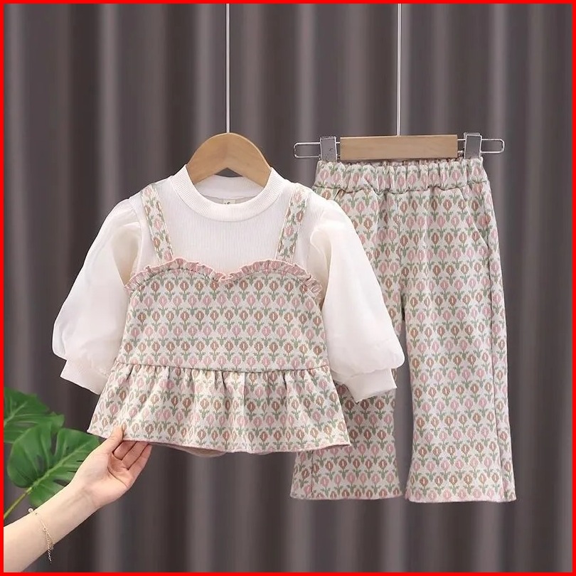 Setelan Anak Perempuan Usia 1-4 Tahun Baju Kaos Katun Lengan Balon Kombinasi Rompi Tweed Rempel Jc