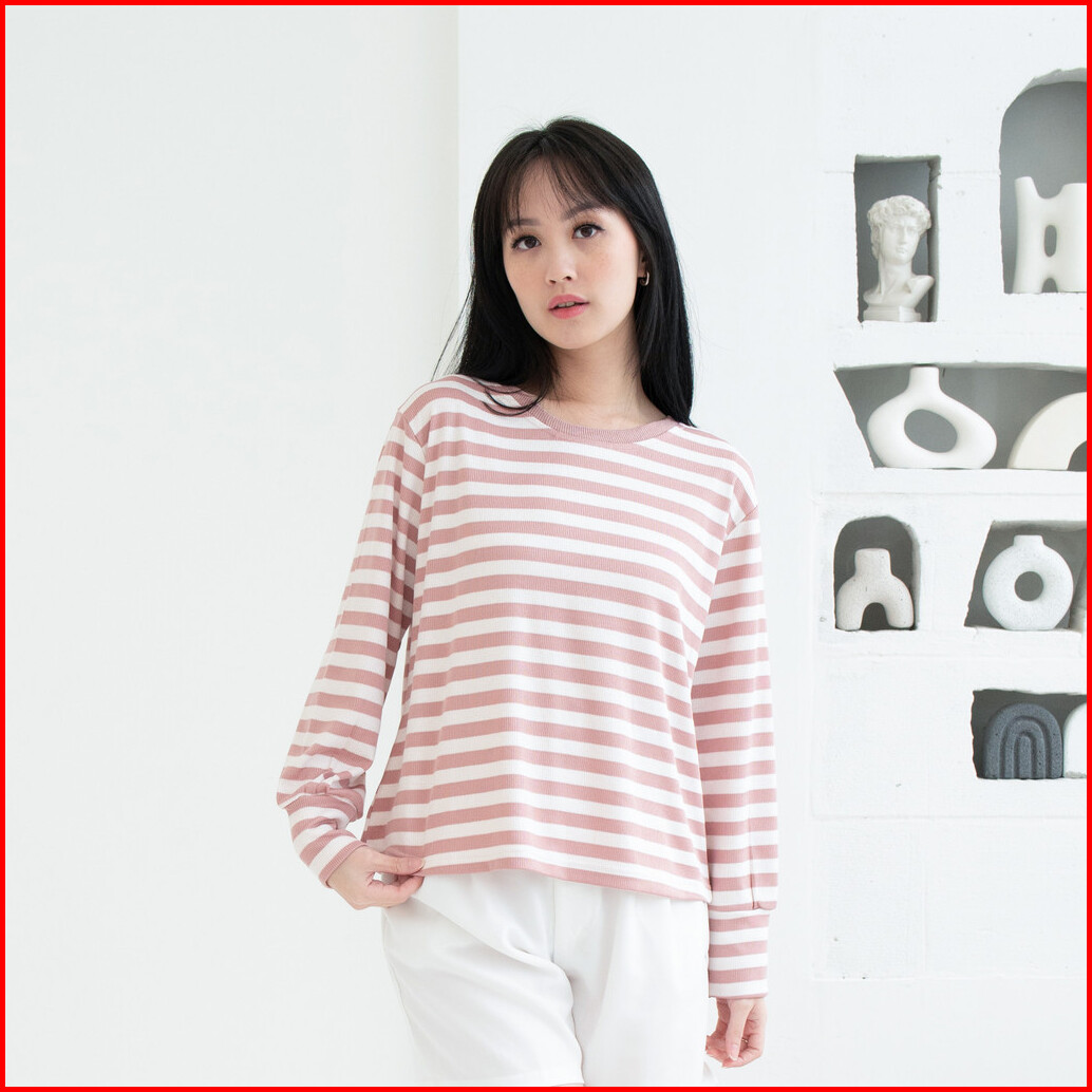 Queentin Kaos Crewneck Wanita 0672 Stretch Yeona Rib Knit Motif Salur Lengan Panjang