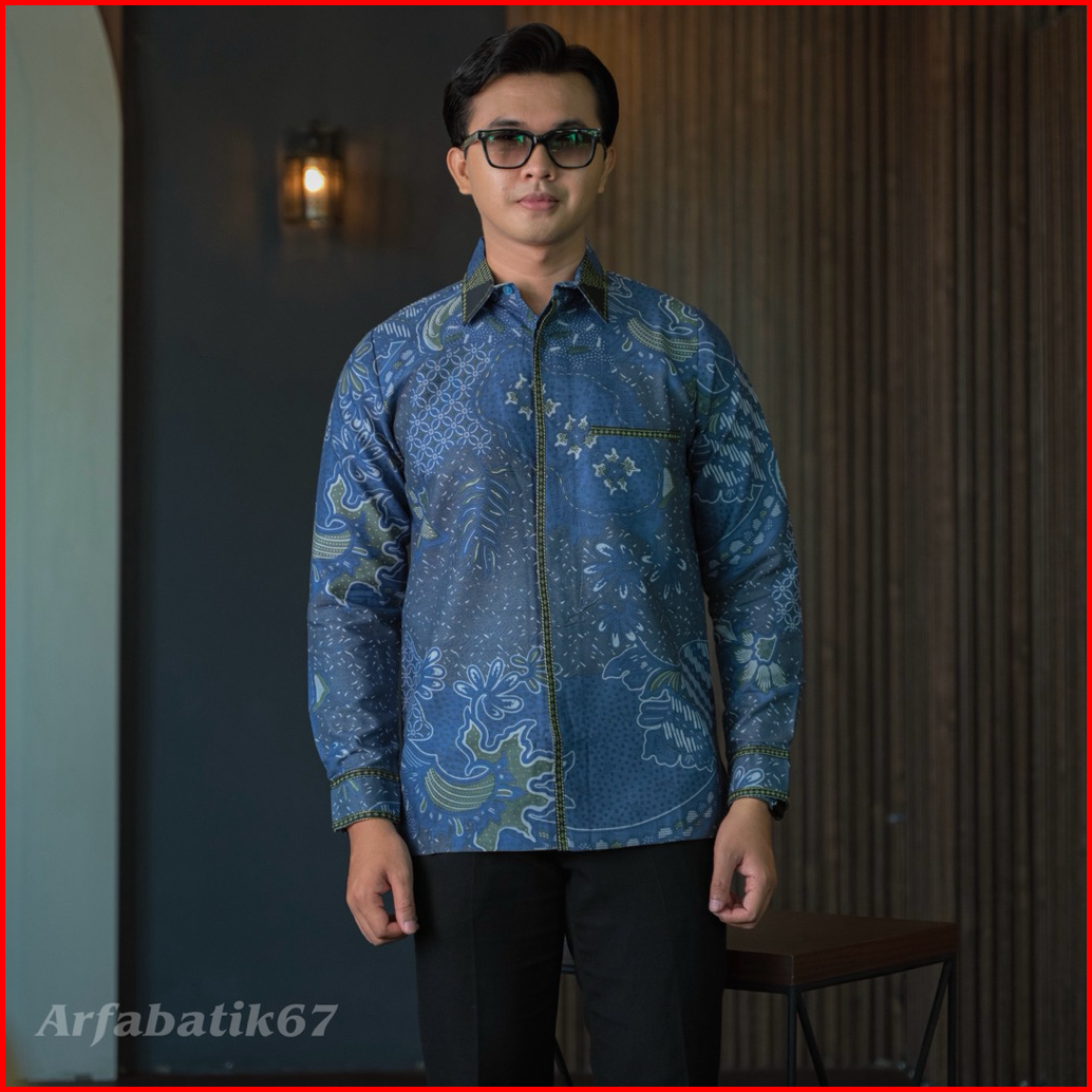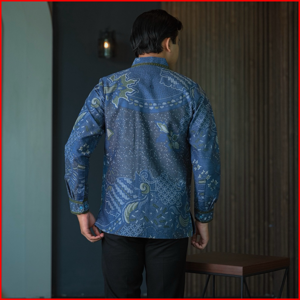 Setangkai Denim Kemeja Batik Smock Bordir Pria Katun Prima Premium Lengan Panjang Lapis Full Furing Trikot Wafle Full Sa
