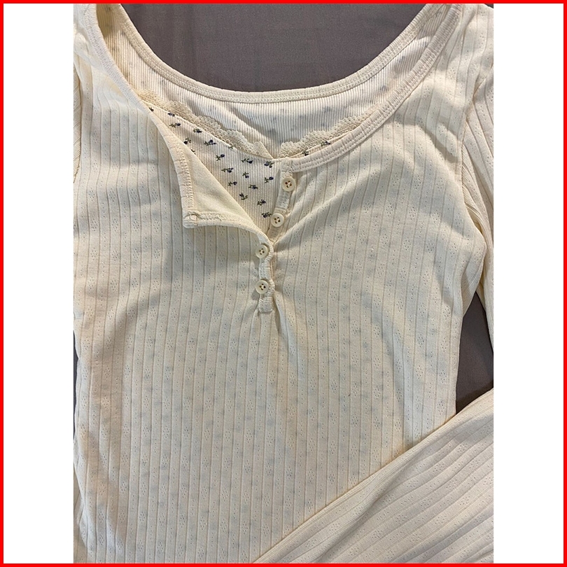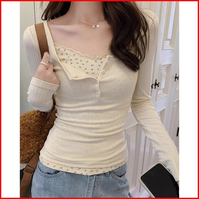 Kaus Lengan Panjang Dua Potong Palsu Sambungan Renda Atasan Slim Fit Aprikot Fashion Wanita Gaya Korea