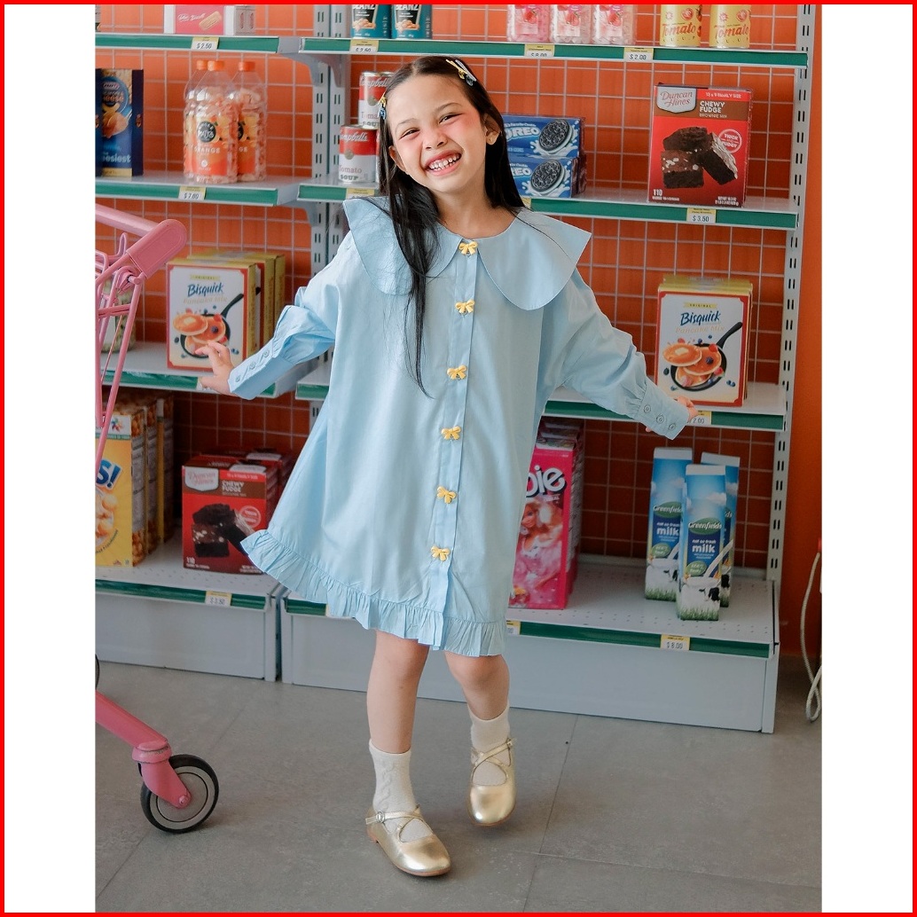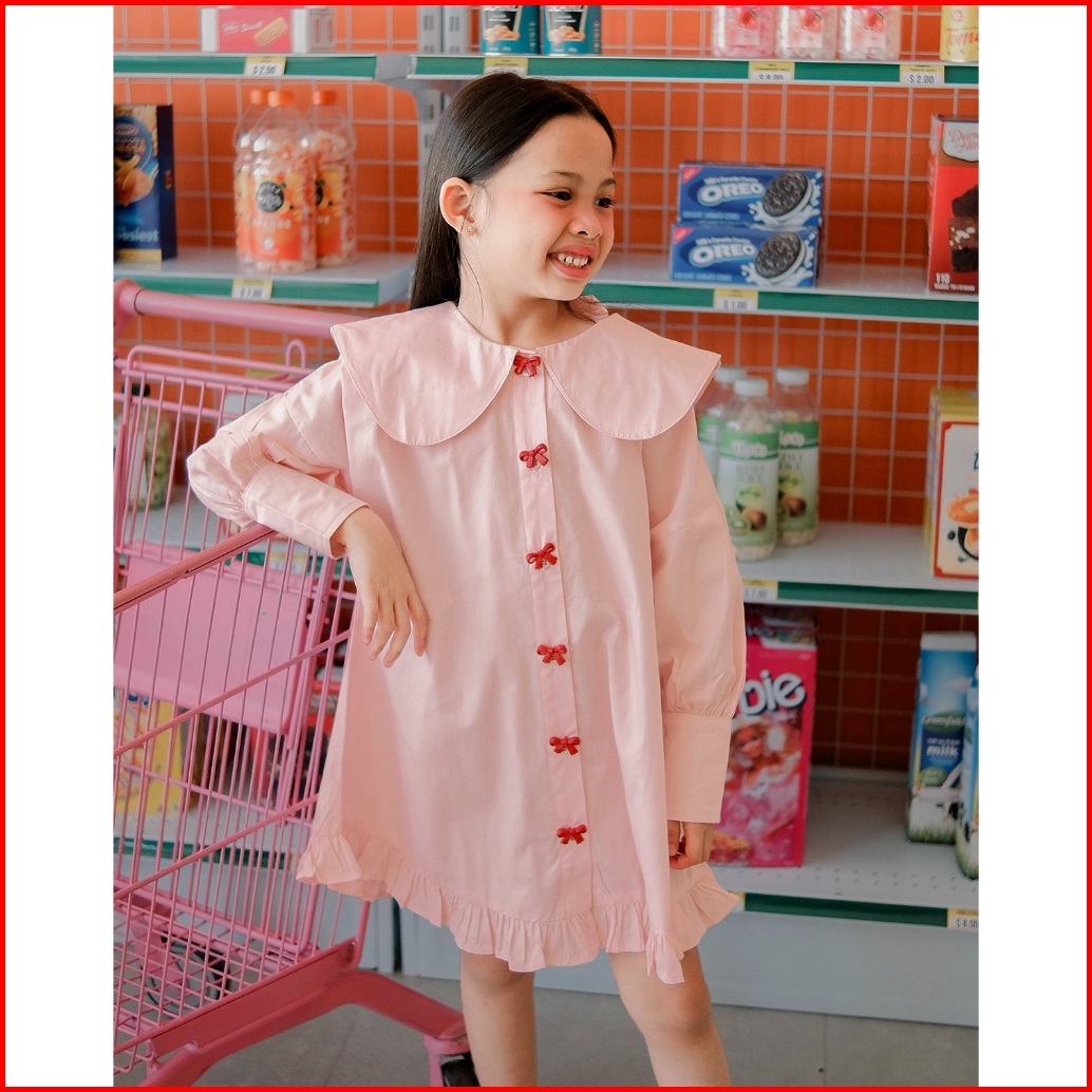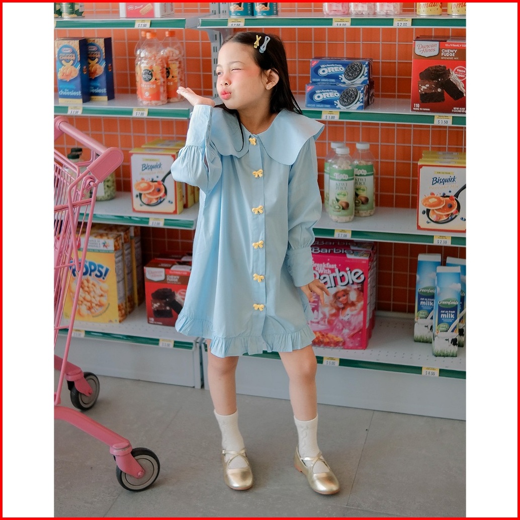 Cecily Dress Hunny Bunny Gaun Pastel Bow Button Anak Perempuan Dress Peterpan Collar