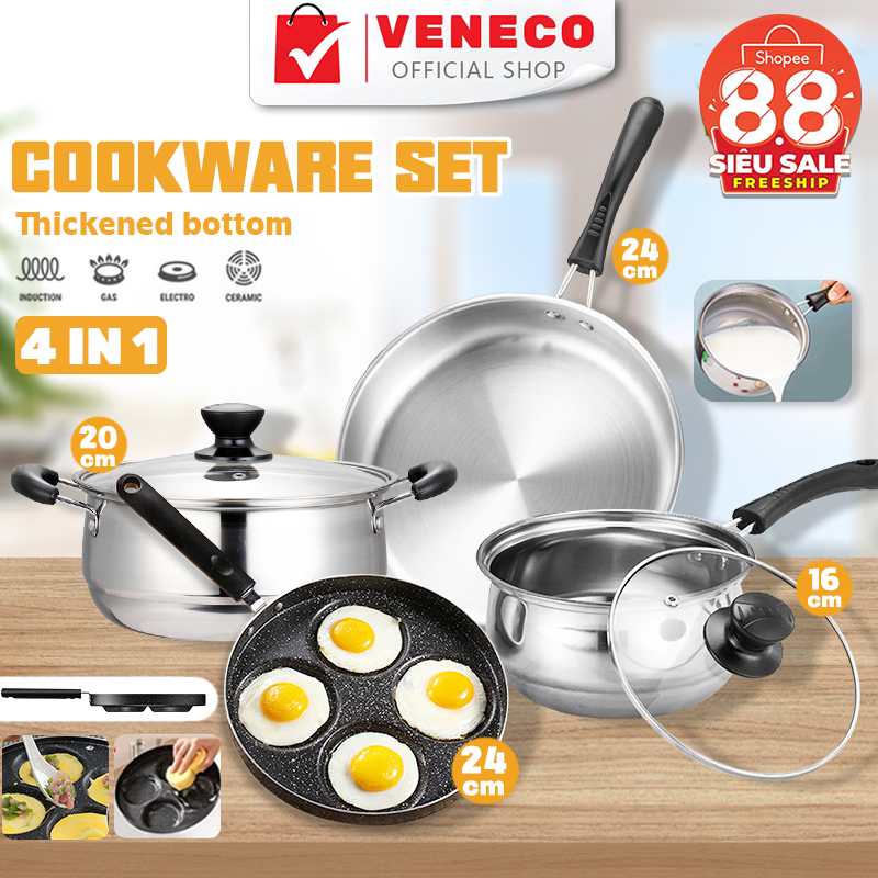 PANCI STAINLESS STEEL 3 Set Panci Sup 22cm, Panci Mie 18cm, Wajan 26cm + Penggorengan Telur Pancake 4 Lubang 24cm