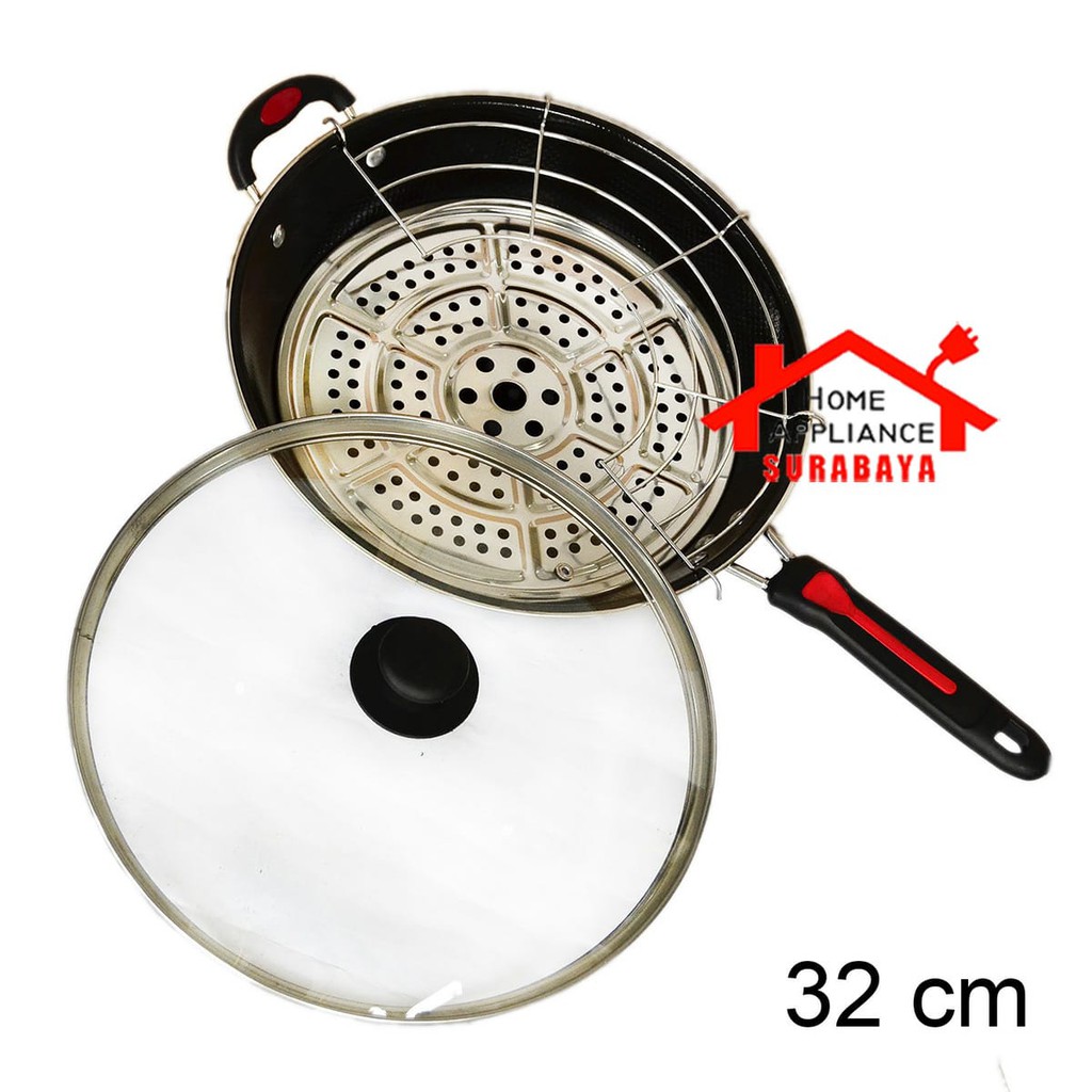 Panci Wajan Goreng Anti Lengket Tutup Kaca + Tirisan Minyak + Saringan Pengukus 32 CM GSF G 1132 KSG