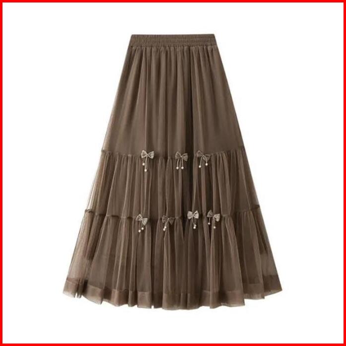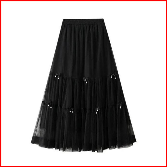 Rok Skirt Tutu Panjang Korean Style - Ruffle Skirt Muslimah - Tulle Layer Ruffle Aksen Pita Mutiara