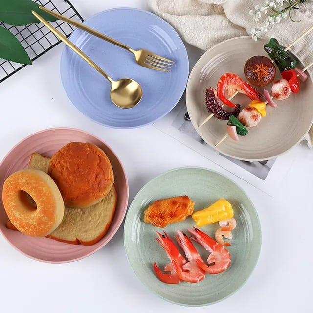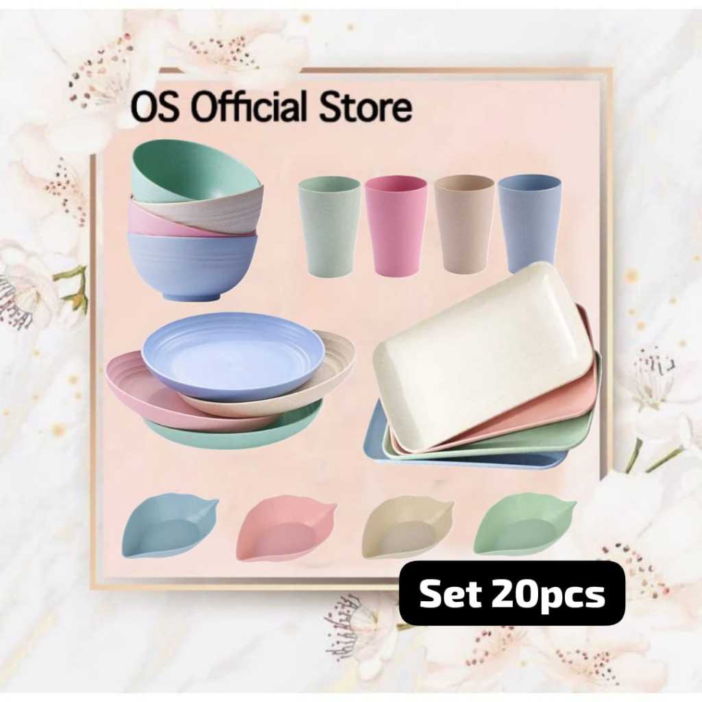 OS PAKET LENGKAP ALAT MAKAN PIRING GELAS MANGKUK 20 PCS BAHAN JERAMI GANDUM WARNA WARNI