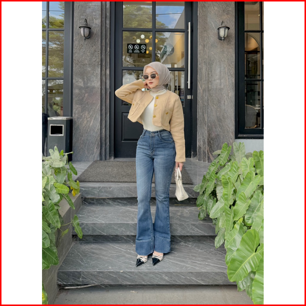 Hazee - Luna Dark Celana Jeans Wanita Cutbray Highwaist Pinggang Tinggi Bahan Melar Ready Stok