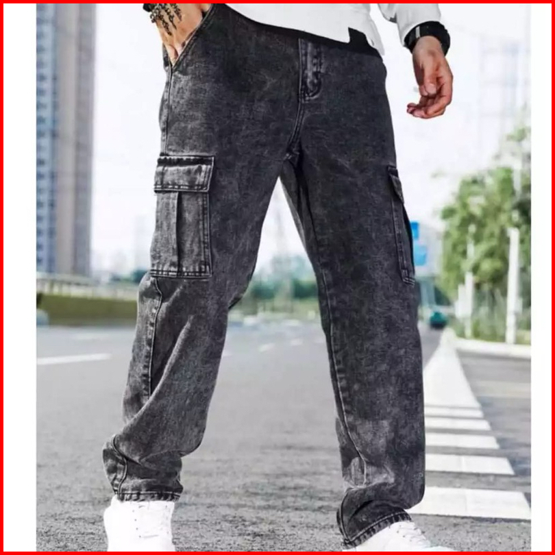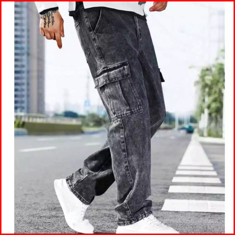 Celana Cargo Panjang Pria Gombrong Korean Style Loose Cargo Pants Blue Jeans Kulot Pants Denim Cowok