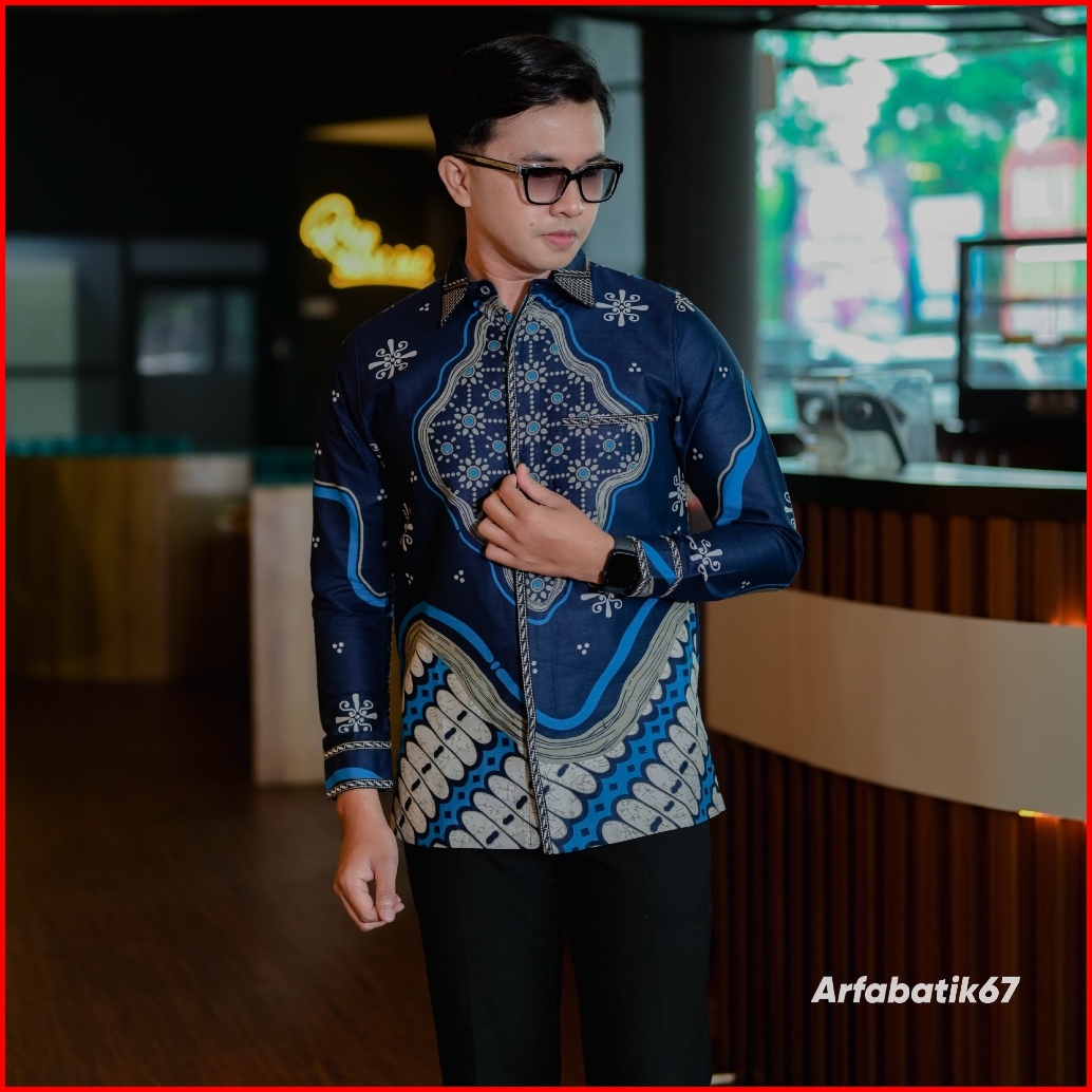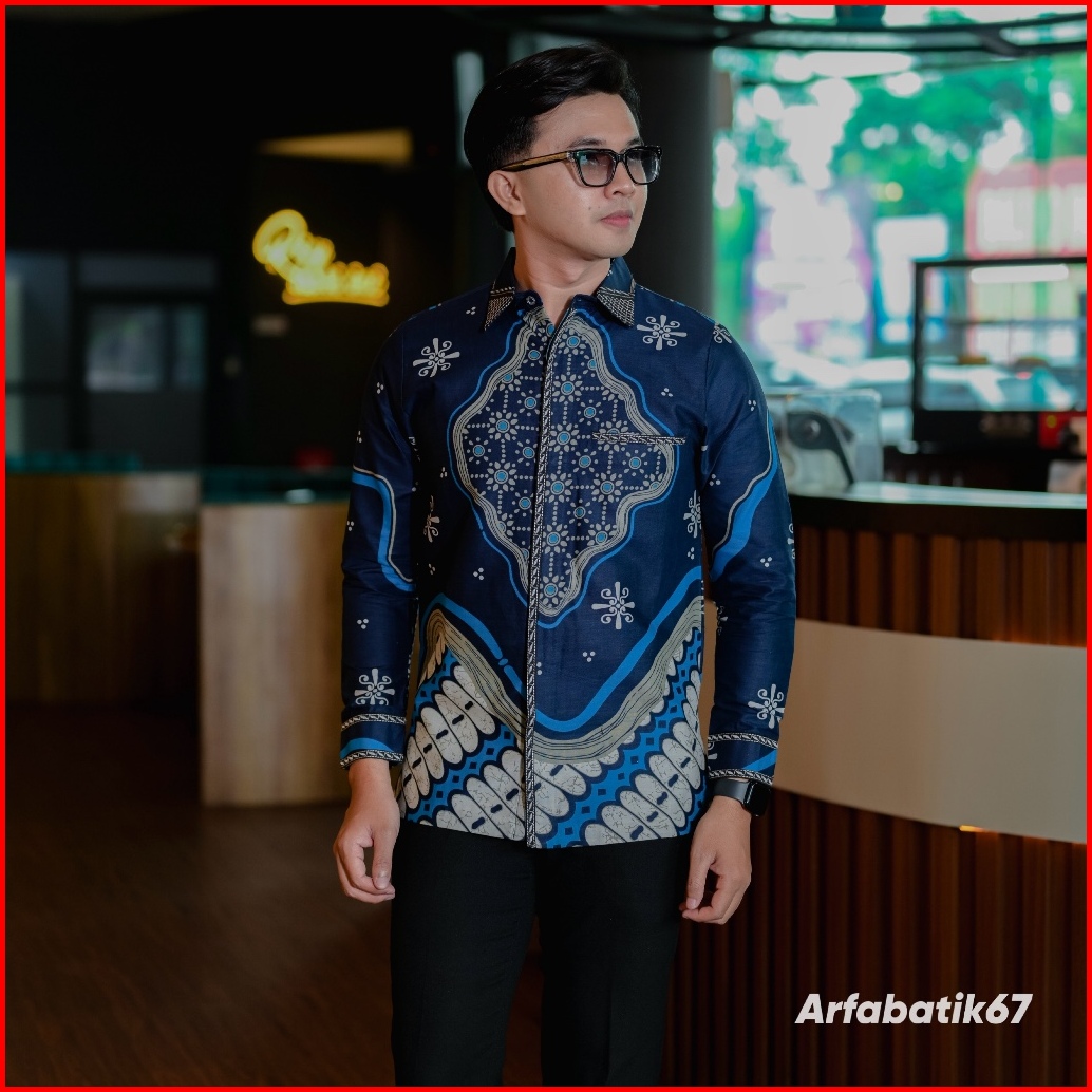 Wajik Navy Kemeja Batik Smock Bordir Pria Katun Prima Premium Lengan Panjang Lapis Full Furing Trikot Wafle Full Sampai