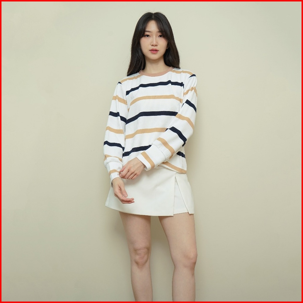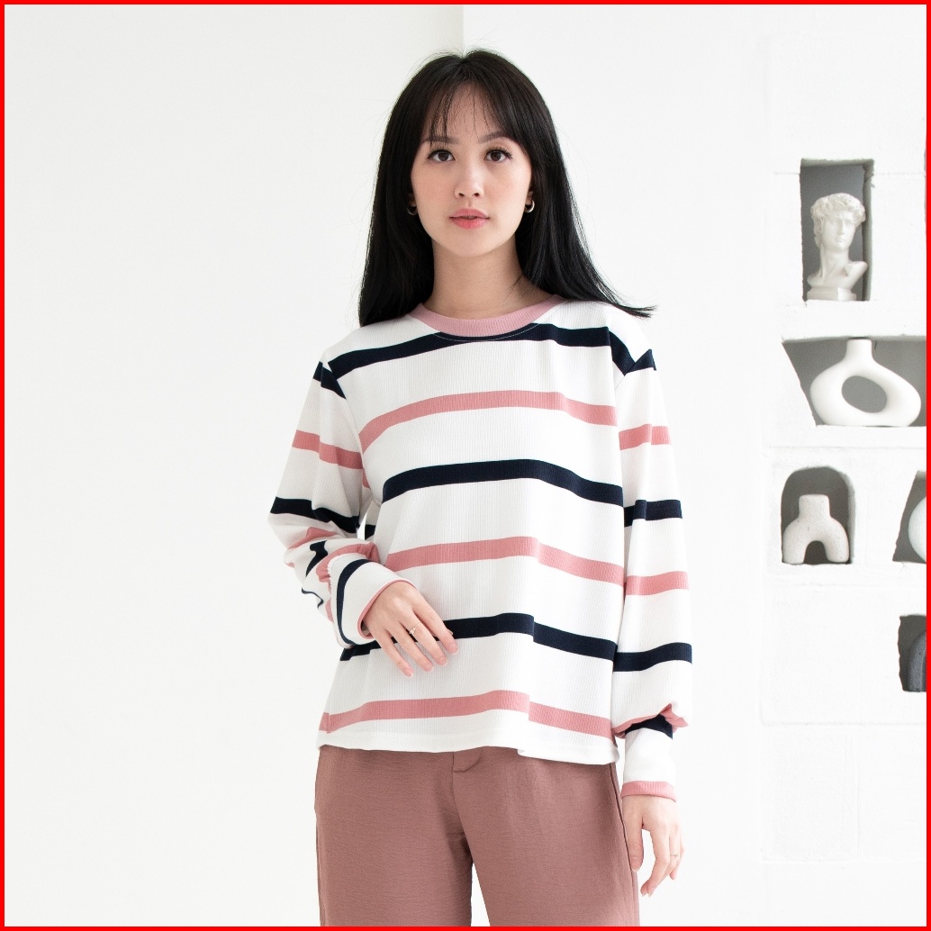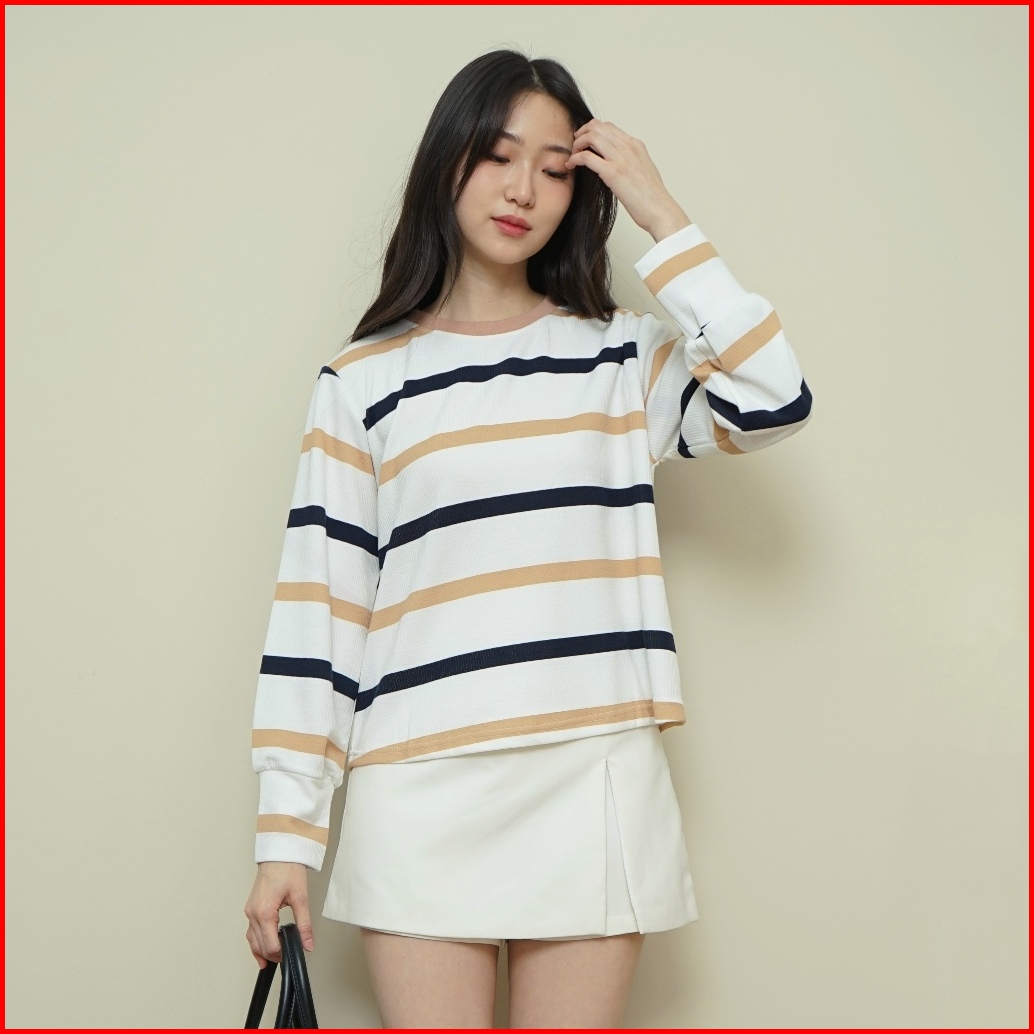 Queentin Kaos Wanita Casual 0671 Stretch Caramel Knit Motif Salur Lengan Panjang