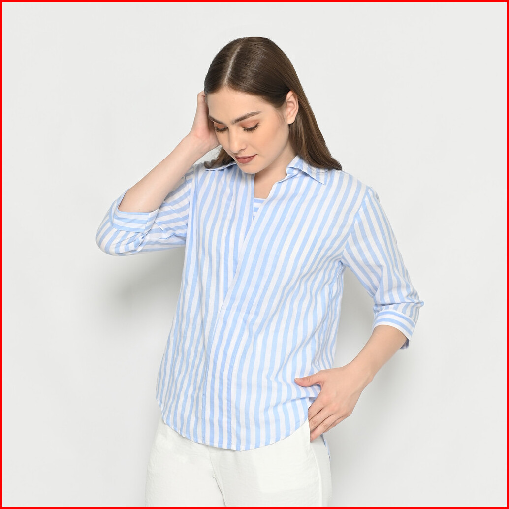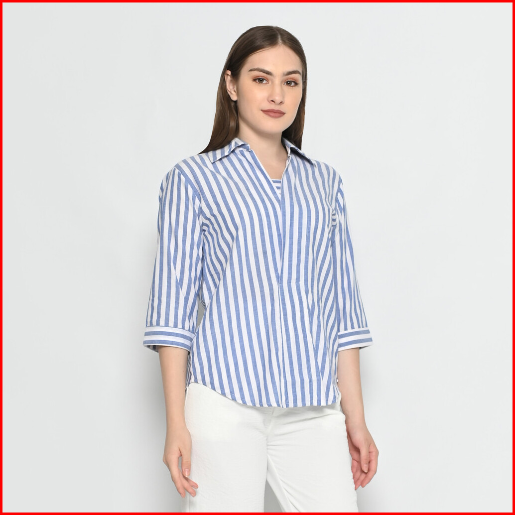 Queentin Blouse Wanita Casual 0175 Katun Yarndyed Motif Salur Lengan Siku 3 4