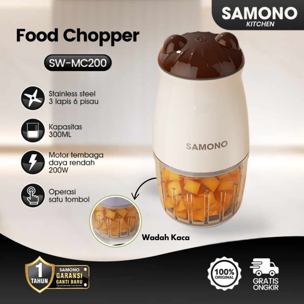 SAMONO Food Chopper Beige Wadah Kaca 300ml 200Watt Penggiling Daging Bumbu MPASI SW-MC200 Garansi 1 Tahun
