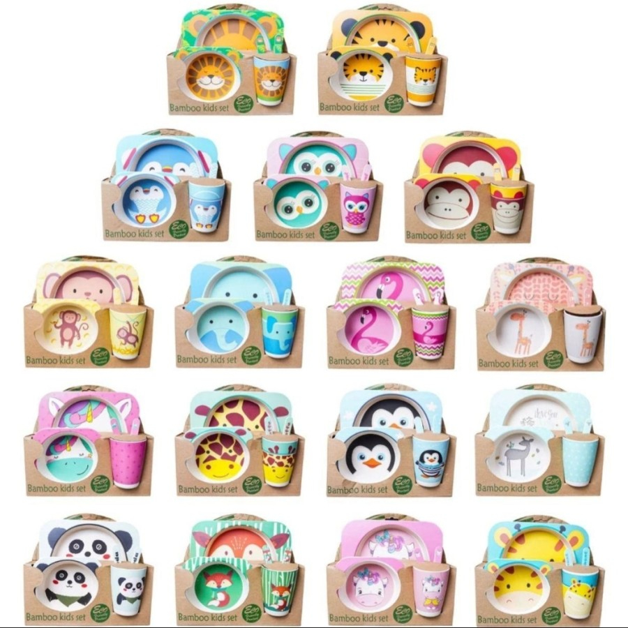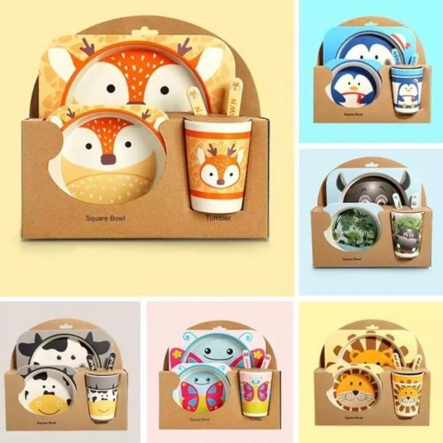 Set Alat Makan Anak 5 in 1 Piring Karakter Lucu Gelas Mangkok Peralatan Bekal Dapur Serbaguna Kids Bamboo Sets Animal Sendok Garpu Souvenir Birthday Lunch Box