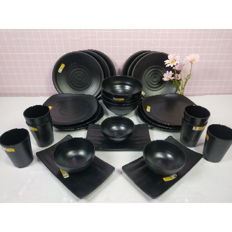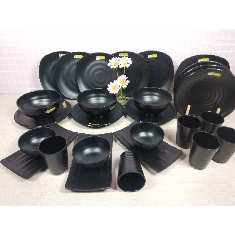 SET MAKAN MELAMIN STONE SERIESS Golden Dragon 27pcs - Piring Kotak - Piring Bulat Datar - Mangkok Sup - Gelas
