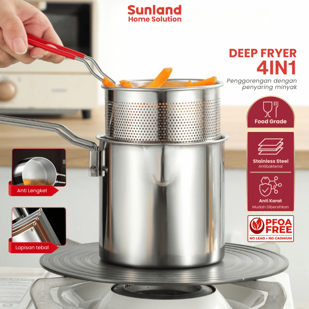 Sunland Home Solution - 4 in 1 Deep Fryer Multi Set Panci Penggorengan Rebus Stainless Steel Saringan Capitan Klip Makanan Panci Rebus Serbaguna