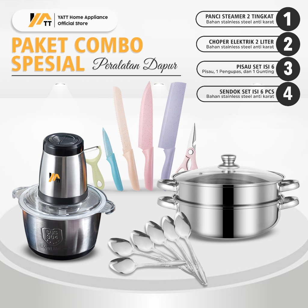 YATT COMBO KITCHENWARE Panci Stainless Tutup Kaca + Chopper 2L + Pisau Set 6in1 + 6 Pcs Sendok