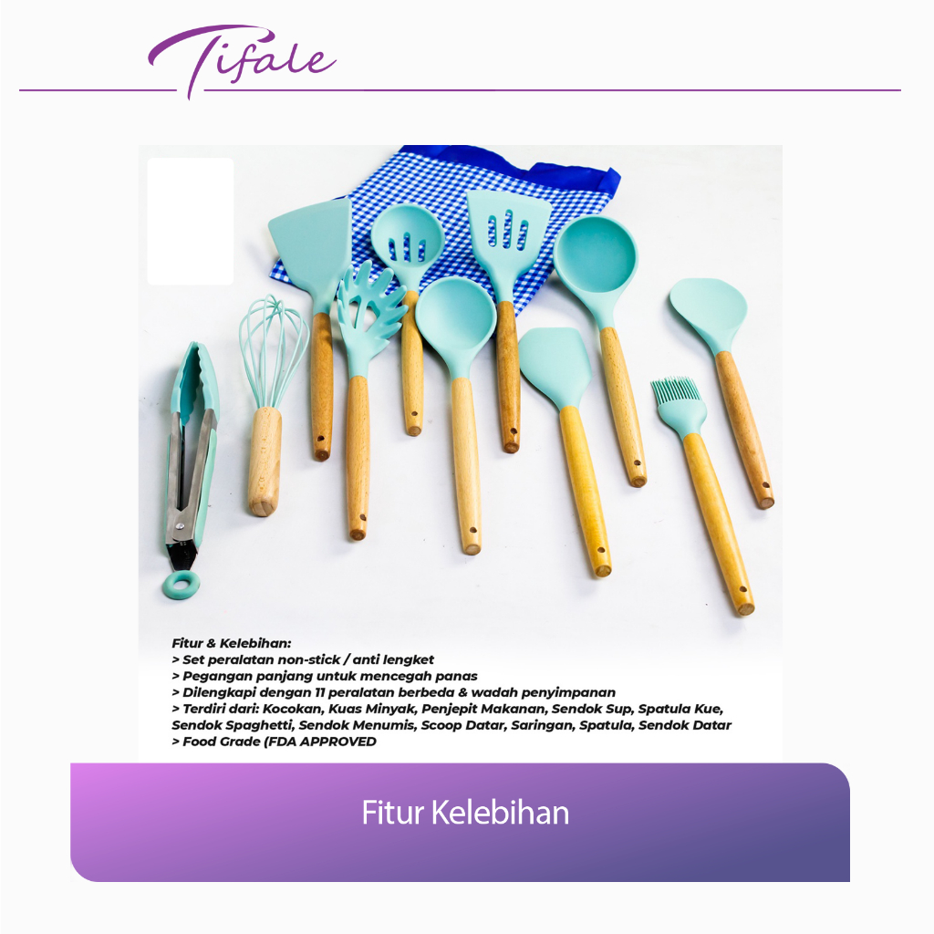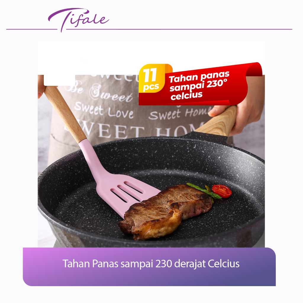 Tifale Silicone Utensil 12 Pcs Spatula Peralatan Masak Sutil Pegangan Kayu Baking Set Alat Masak