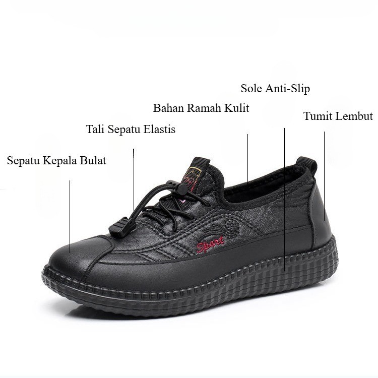 [ Stock]Sepatu Wanita Kerja Kantor Anti Slip Warna Hitam Merah - Flat Shoes Nyaman Untuk Ibu Slip On Kulit Sintetis Sol Lembut HF06