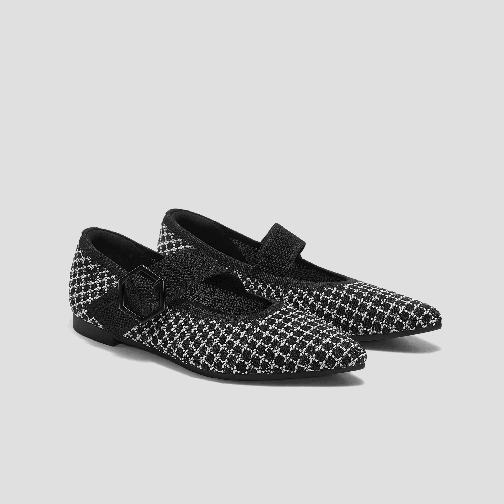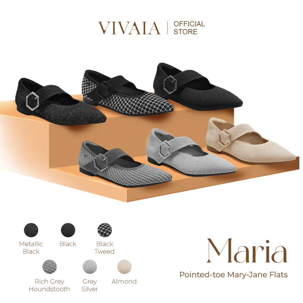 VIVAIA Sepatu Wanita Pointed-toe Mary-Jane Flats (Maria) - Almond | Grey Silver | Black | Rich Grey Houndstooth | Metallic Black | Black Tweed