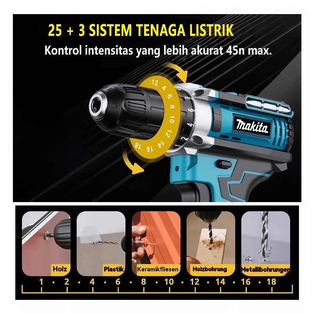 MAKITA Mesin Bor Baterai Tangan Cordless Drill Mesin Bor 2Baterai Cas 10mm Tangan Murah Berkualitas 3 Speed Bor Listri