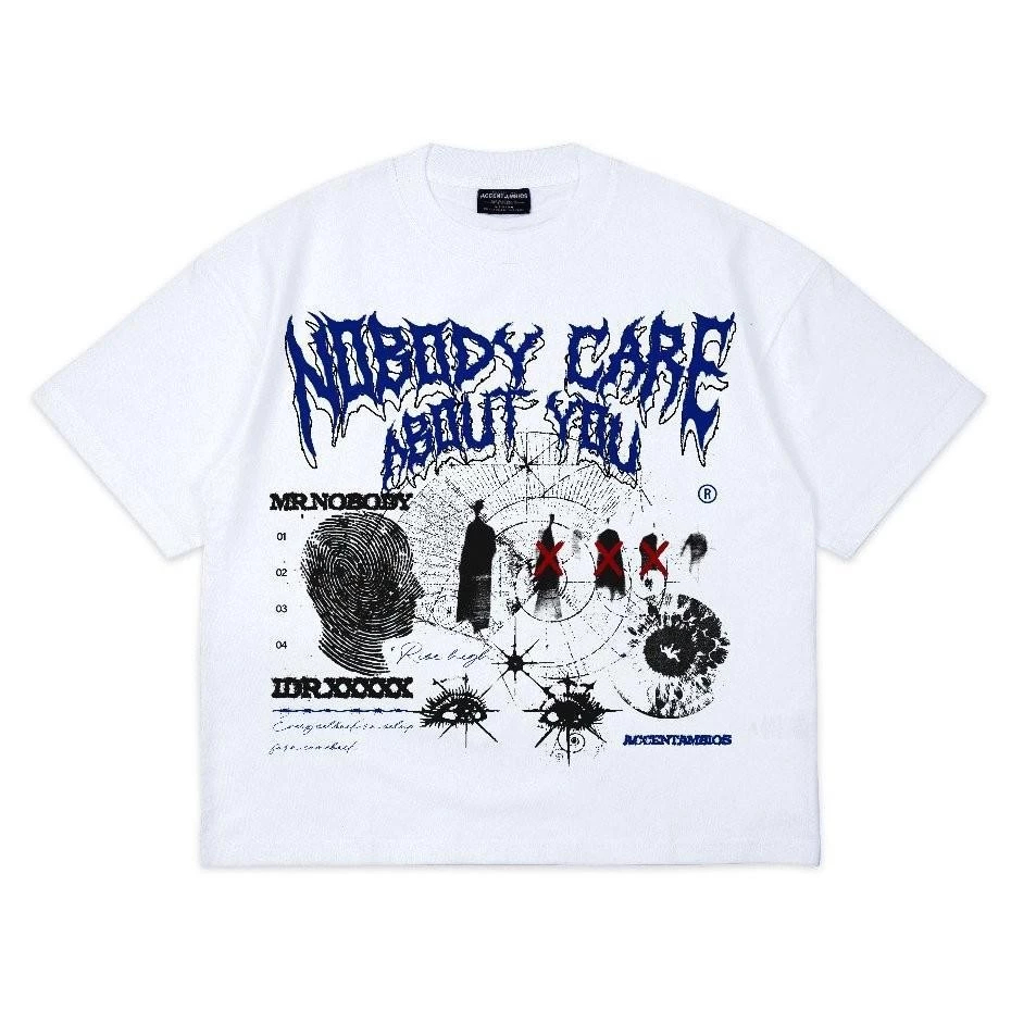 Kaos Boxy fit Oversized Tshirt Nobody Care White Santai combed printing Streetwear C0496 Kaos Pria Lengan Pendek Murah