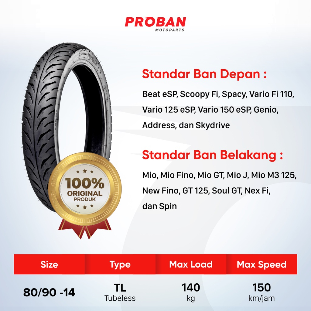 PAKET BUNDLE BAN DEPAN BELAKANG SEPASANG RING 14 BAN MOTOR TUBELESS PROBAN 80/90-14 & 90/90-14