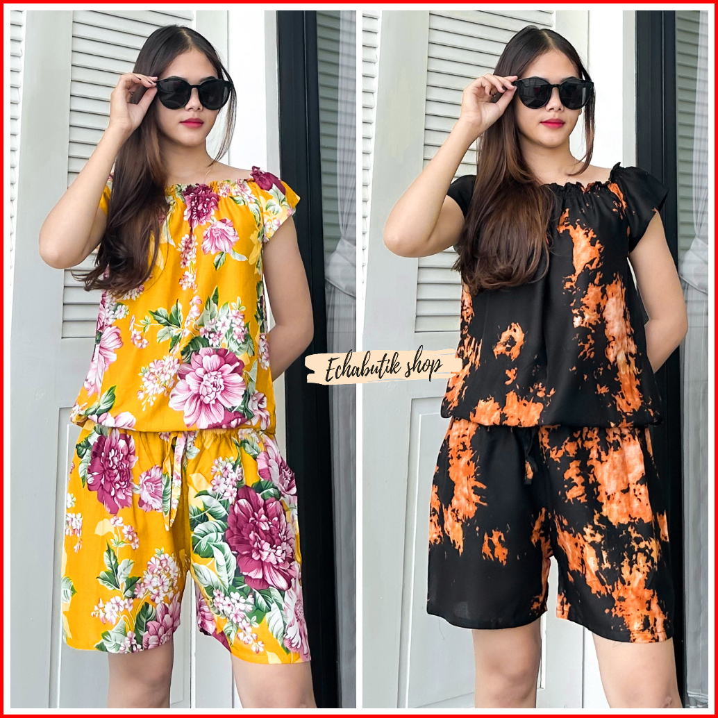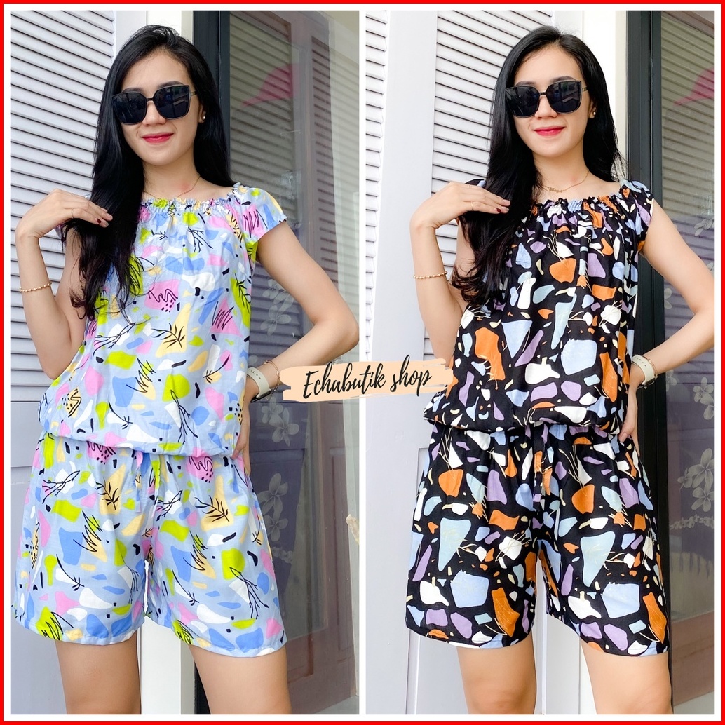 Jumsuit Sabrina Pendek Bali Abstrak