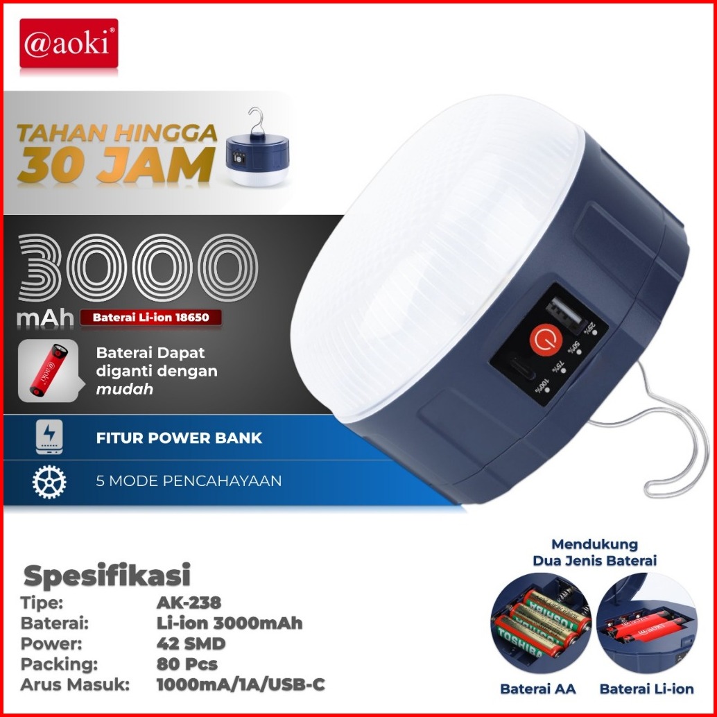 Lampu Emergency Lampu Portable Aoki Ak-238 3000mah Tahan Hingga 30jam - 5 Mode Cahaya - Mode Powerbank