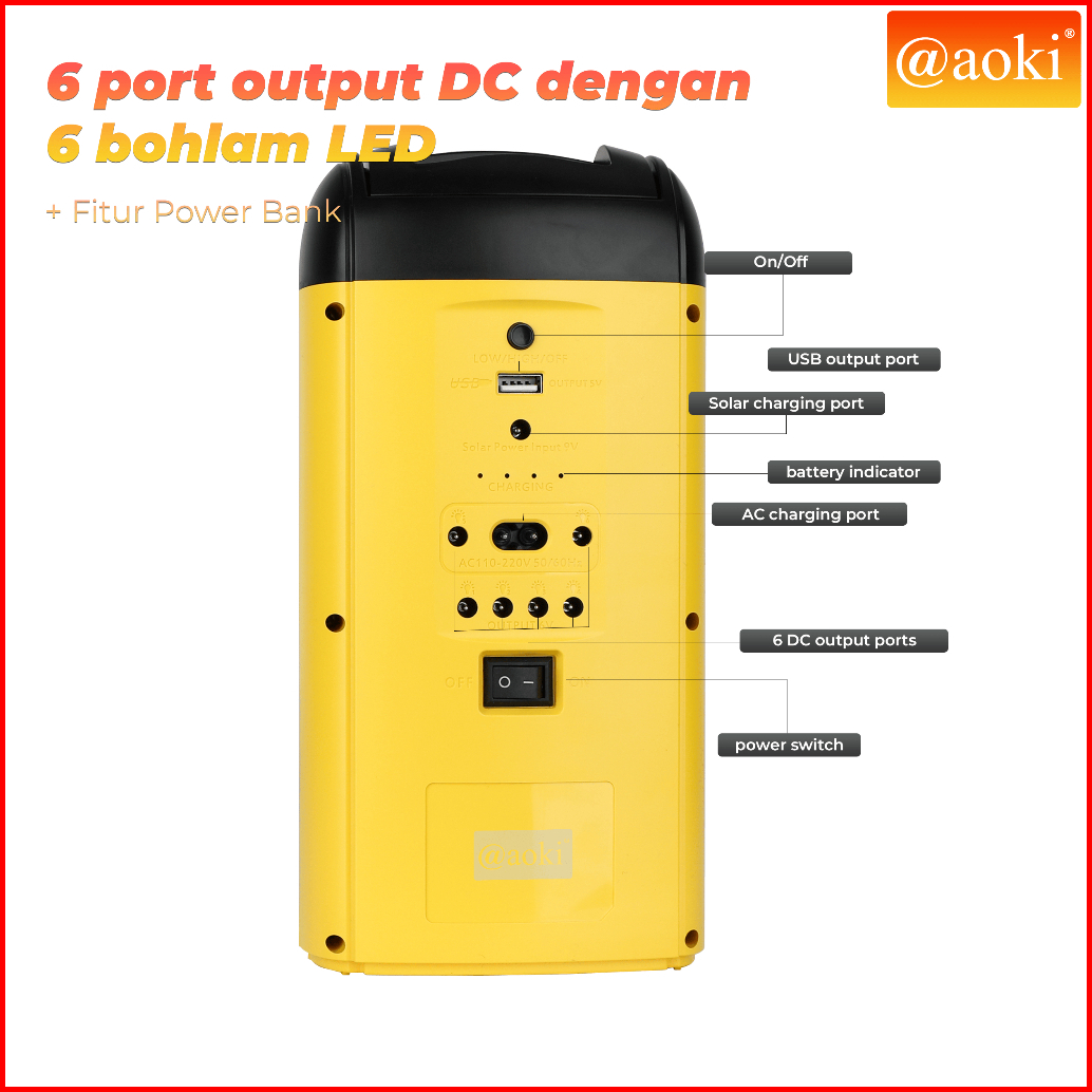 Aoki Solar Power System Dengan Power Bank Pengisian Usb 6 Port Dc Dan Baterai Isi Ulang Kapasitas Tinggi Lampu Darurat M