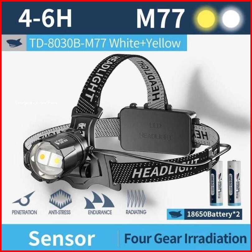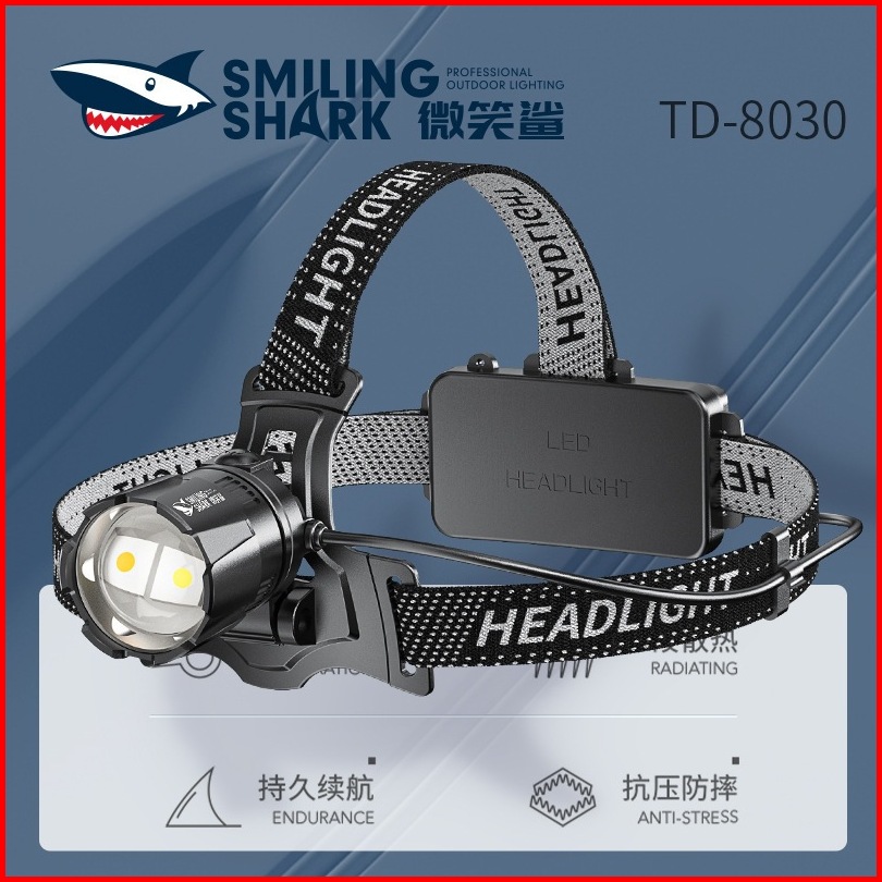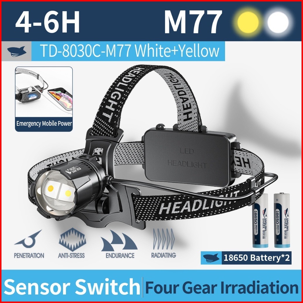 Senter Kepala Led Smiling Shark Td-8030 M77 - 2 Led Cahaya Putih Dan Kuning - Zoom Jarak Jauh - Mode Powerbank Dan Senso