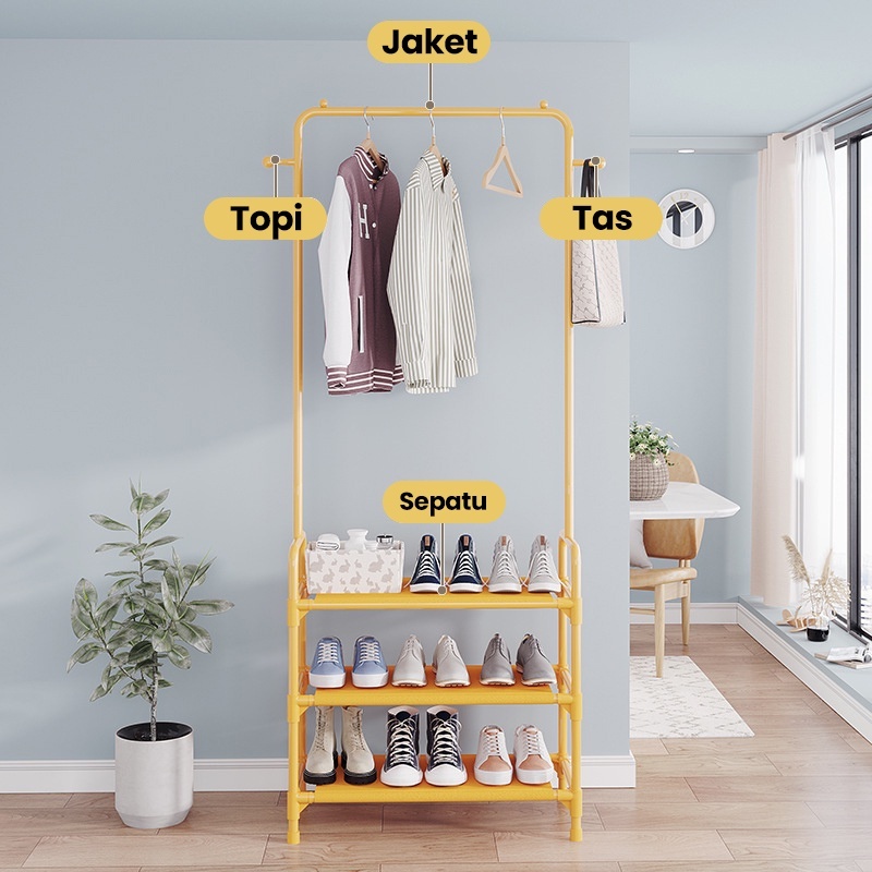 Rak Gantungan Baju Berdiri Dengan 2 Rak Stand Hanger Jemuran Tempat Tas/Topi Rak Kamar Mandi