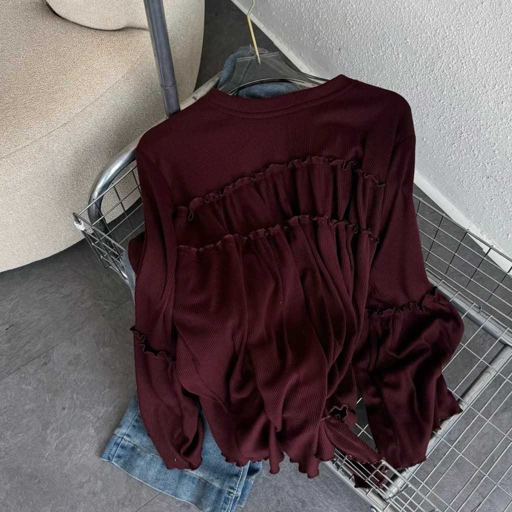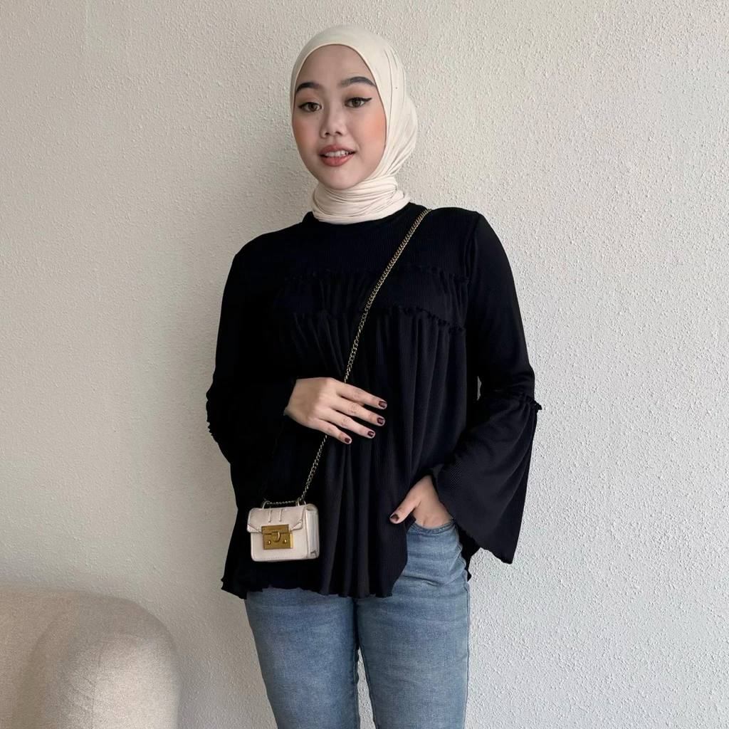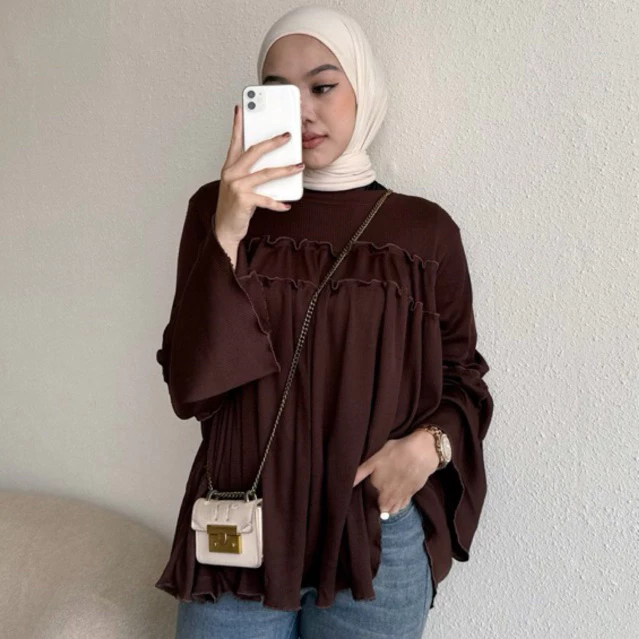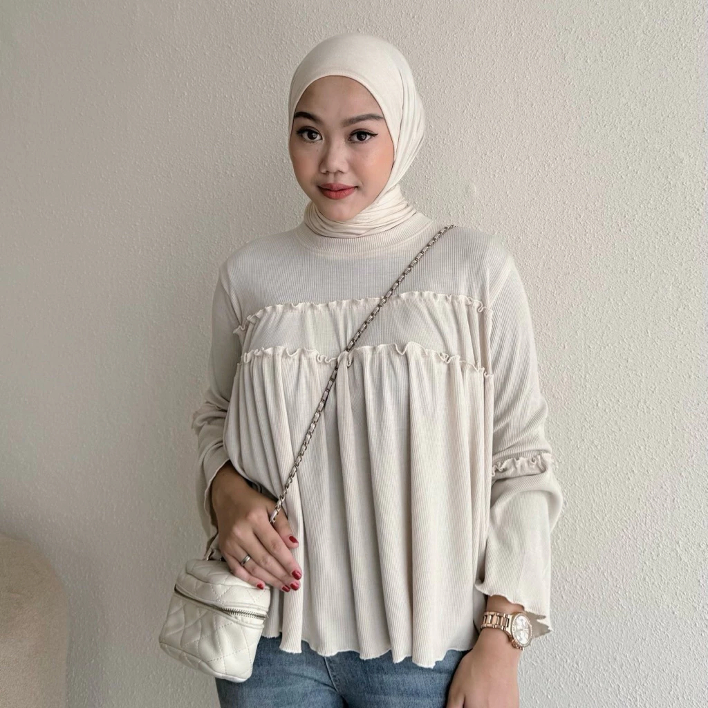 Atasan Wanita Kekinian Blouse Knit Rib Taupia Kaos Polos LEngan Panjang Ruffle Basic Series PRemium Best Seller Murah