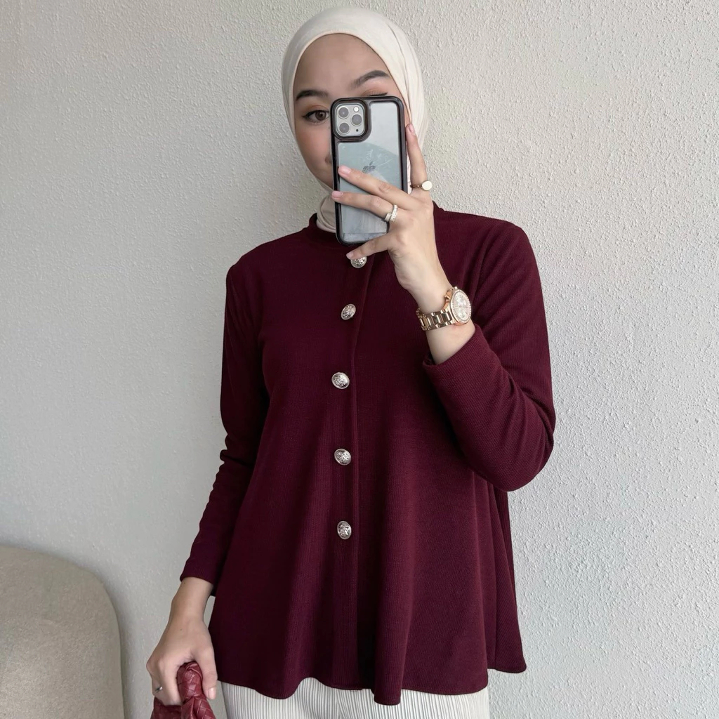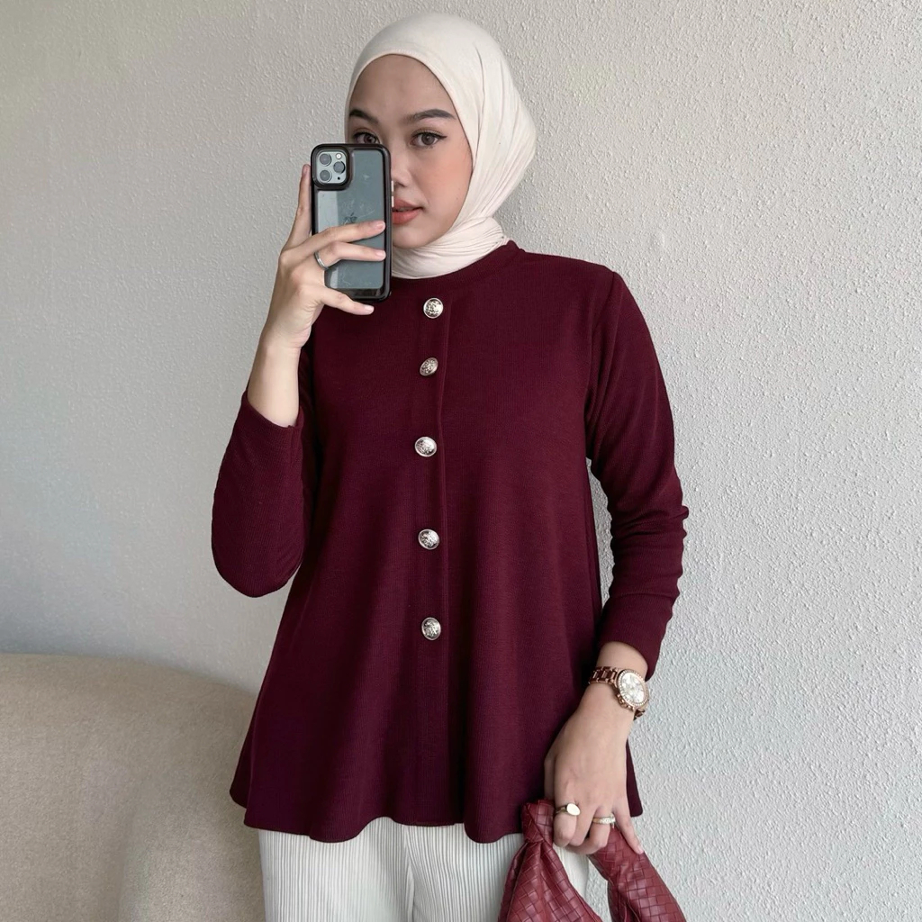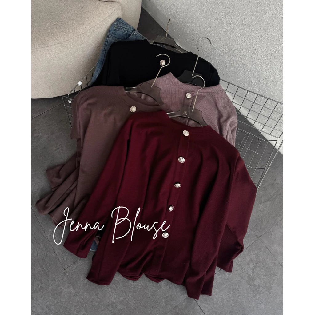 Atasan Wanita Kekinian Blouse Knit Jenna Top Kancing Gold Lengan Panjang Motif Polos Series Premium Korean Style Murah