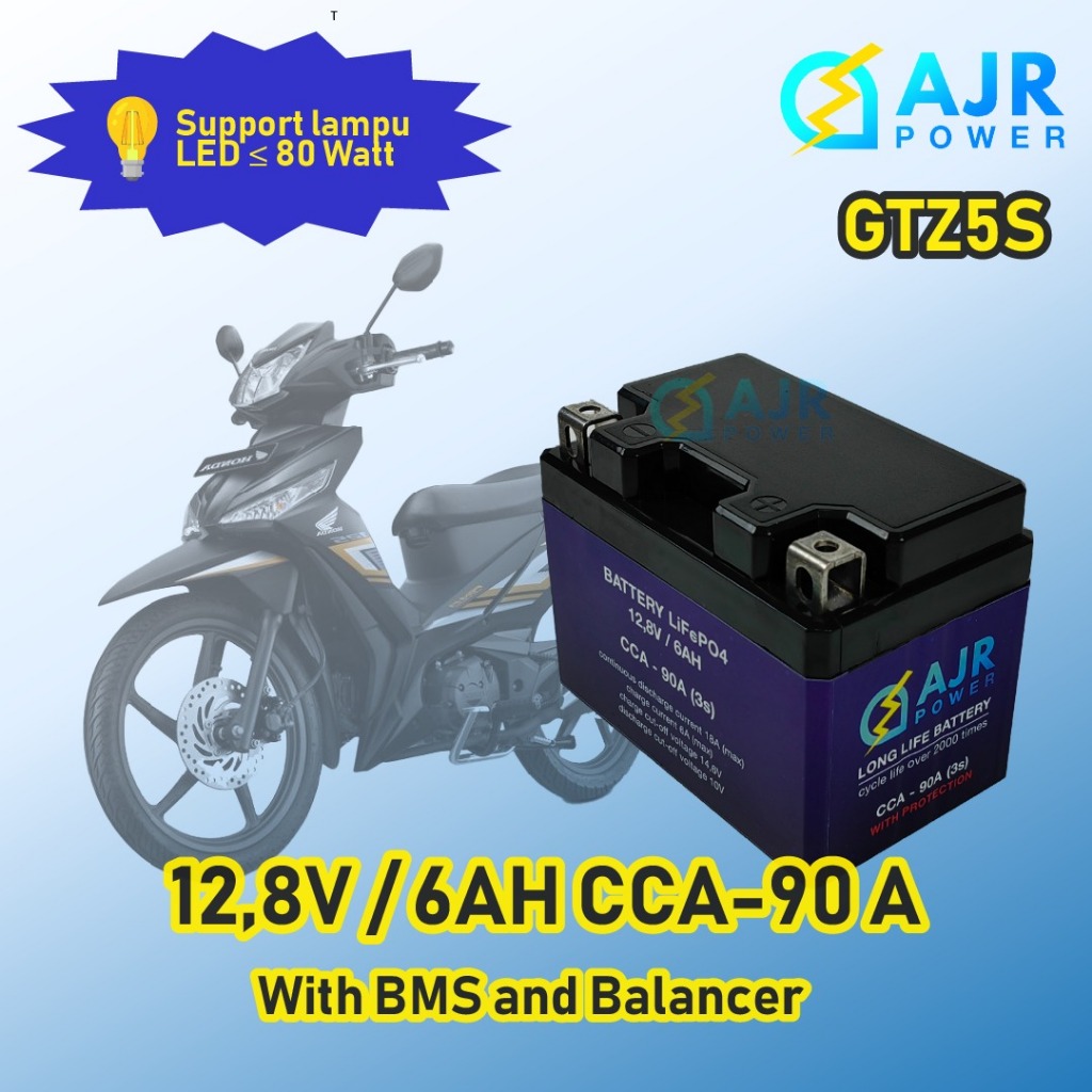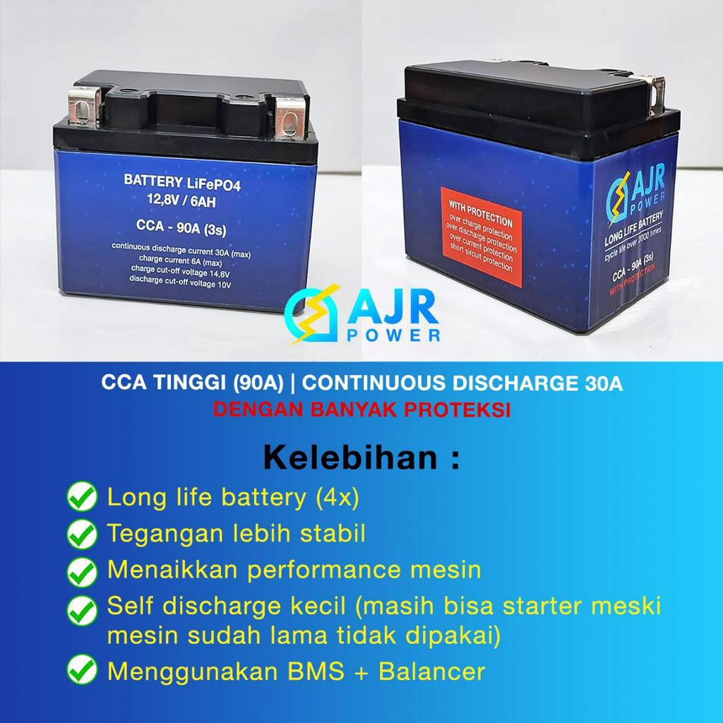 AKI ACCU Lithium iron phospat LiFePo4 AJR POWER sepeda motor BeAT REVO SUPRA X MIO GTZ4V GTZ5S YTZ5S 12V 12,8v 6AH dengan BMS dan Balancer bisa STARTER
