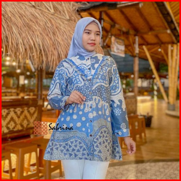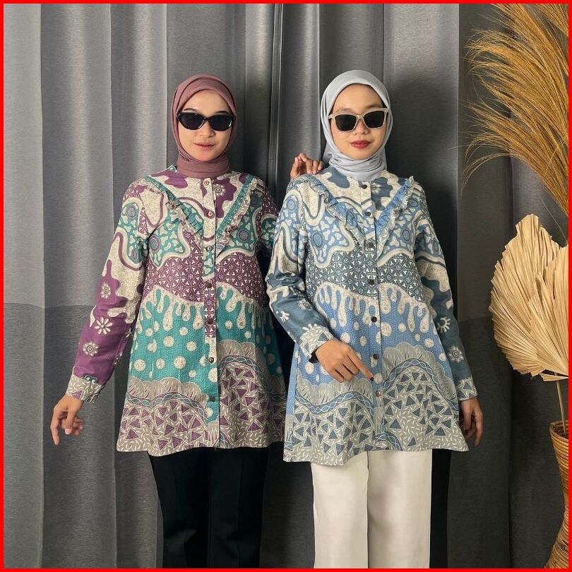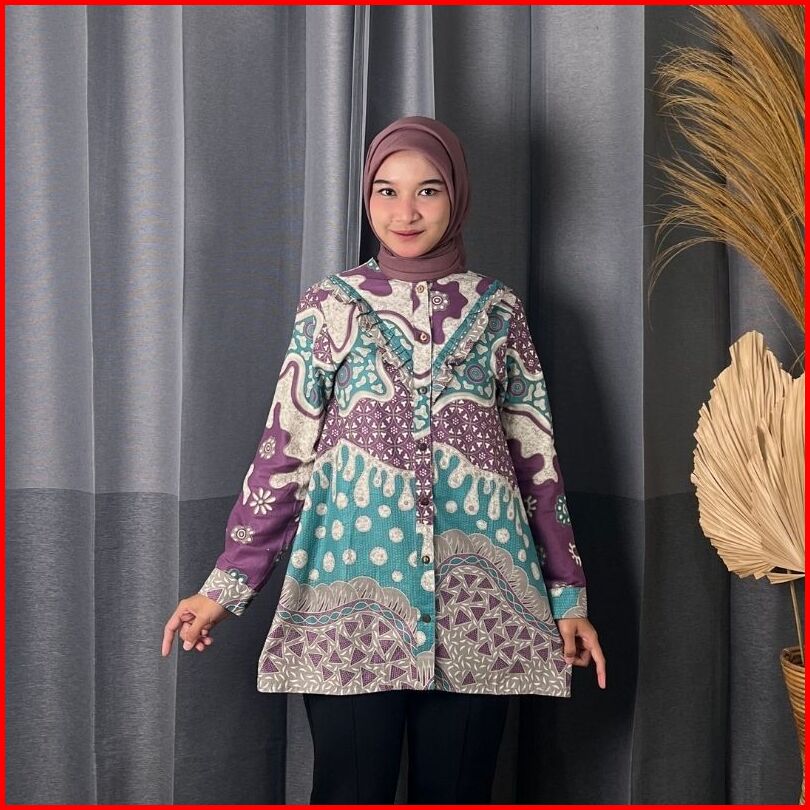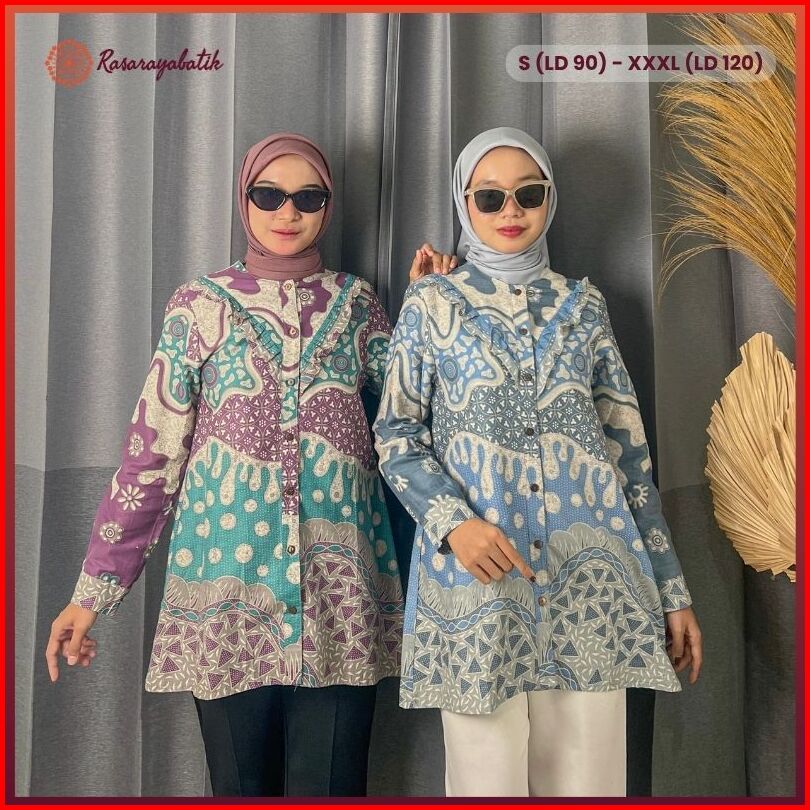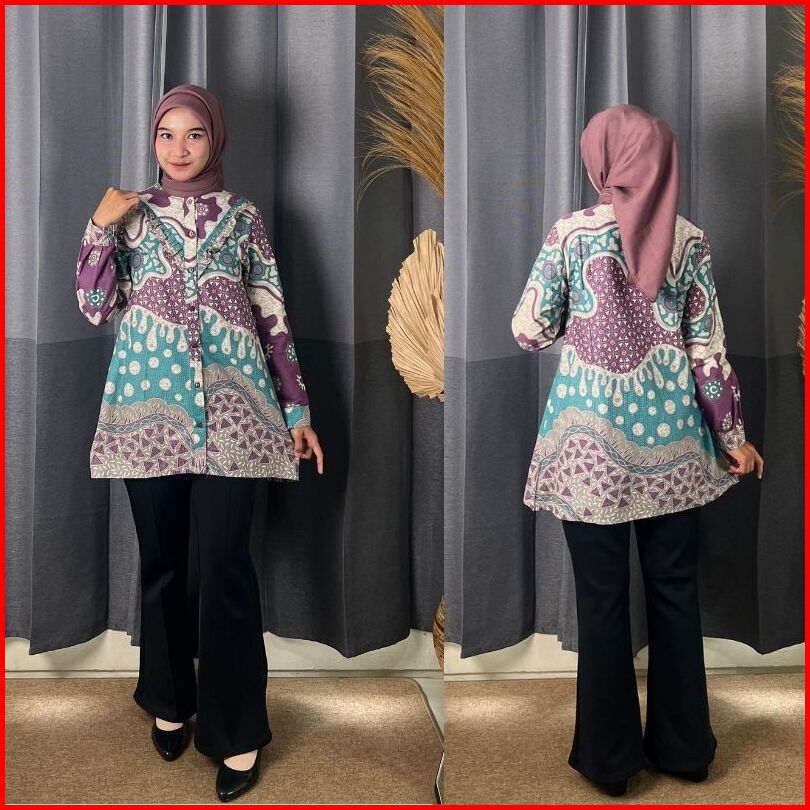 Rasaraya Batik Khaula Blouse Wanita Katun - Atasan Batik Kerja Kantor Motif Abstrak Lilac Dan Grey