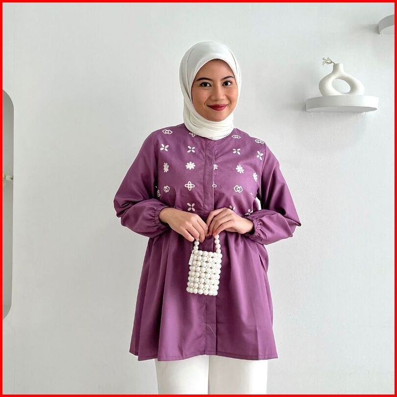 Rasaraya Batik Lovie Blouse Wanita Katun - Atasan Batik Cap Ungu Mauve Busui Friendly Lengan Panjang