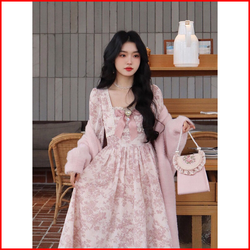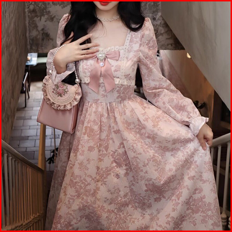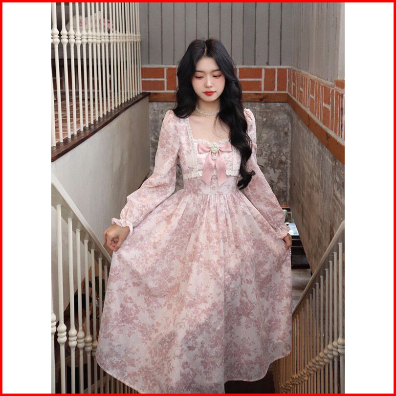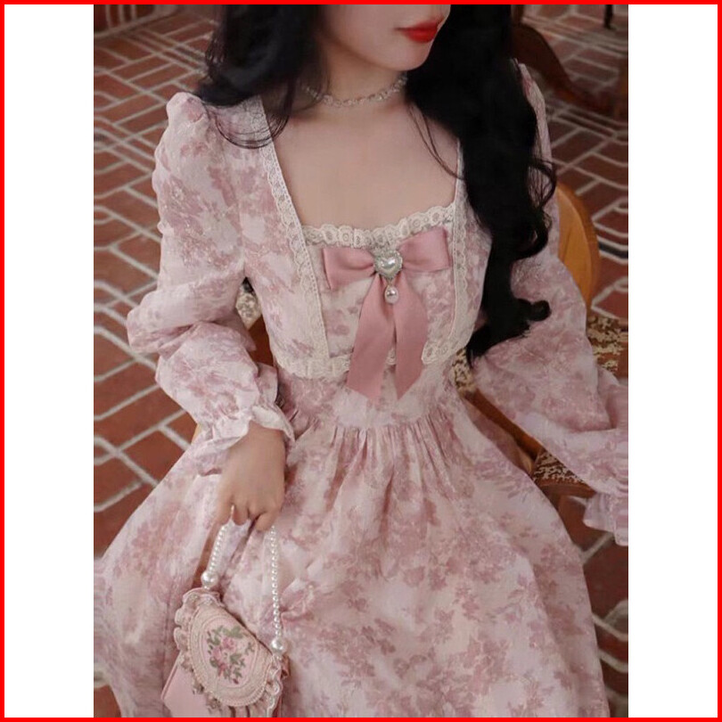 Bow Pink Long Dress For Women Spring And Autumn New Style Sweet Waist Floral Princess Long Skirt Fairy Long Dress Dress