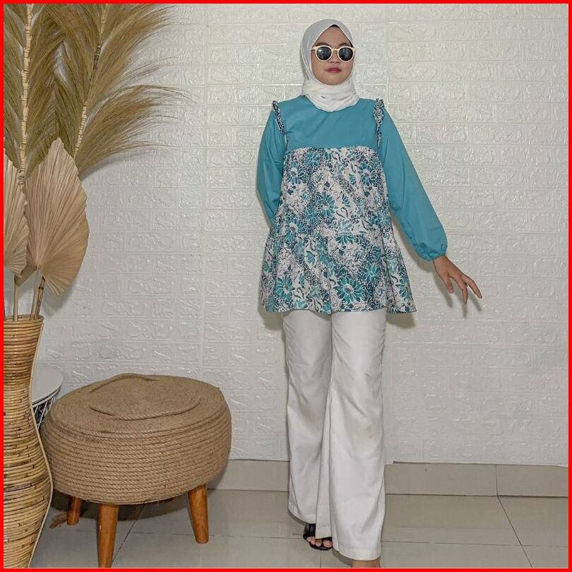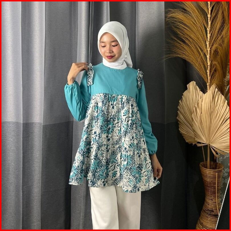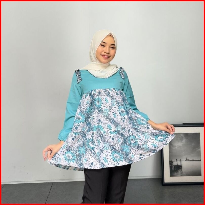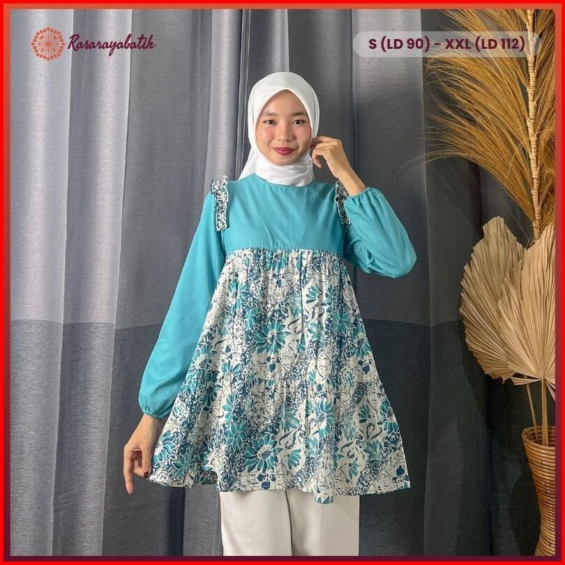 Rasaraya Batik Hester Blouse Wanita Katun - Atasan Batik Cap Kerja Kantor Warna Turqoise Elegan