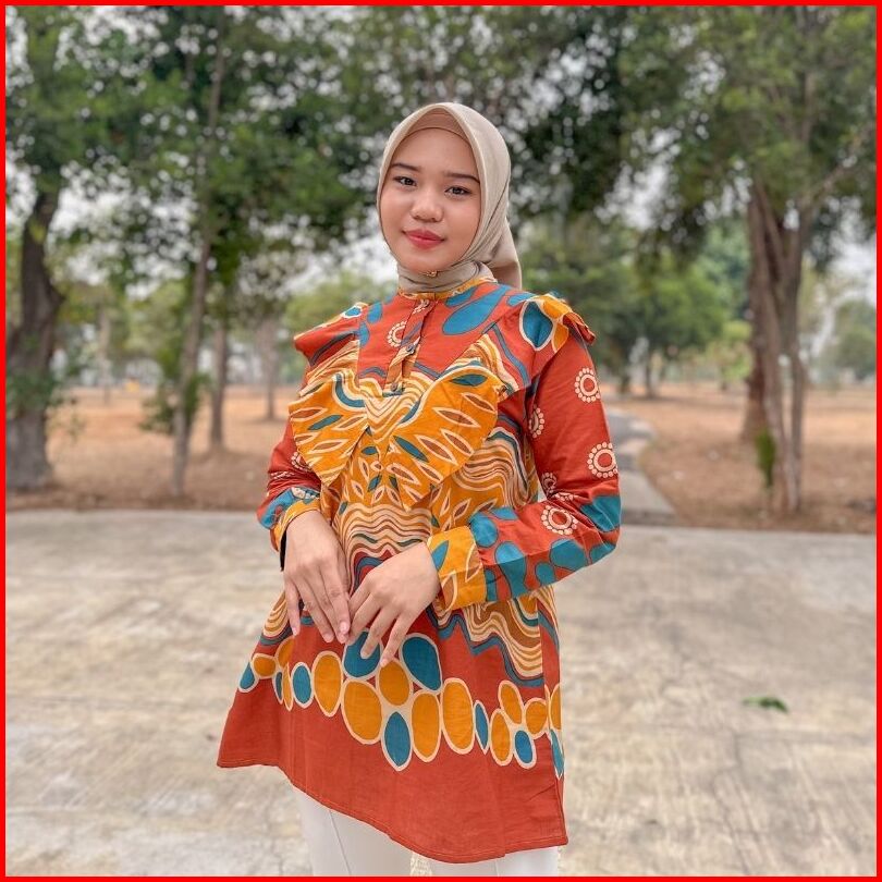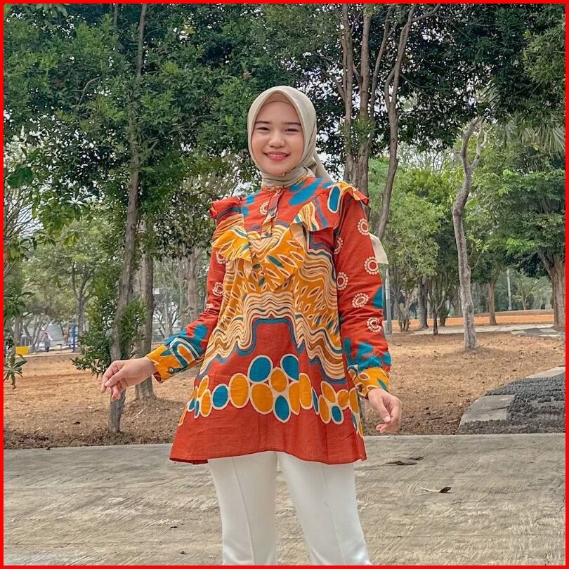 Rasaraya Batik Ovila Blouse Wanita Katun - Atasan Batik Kantor Warna Bata Terracotta Dengan Ruffle