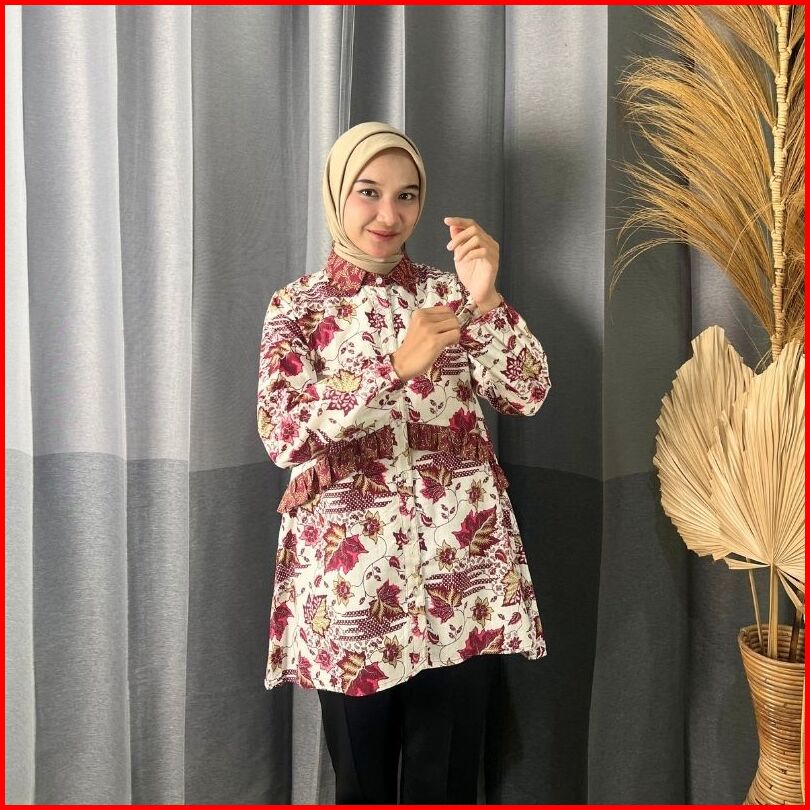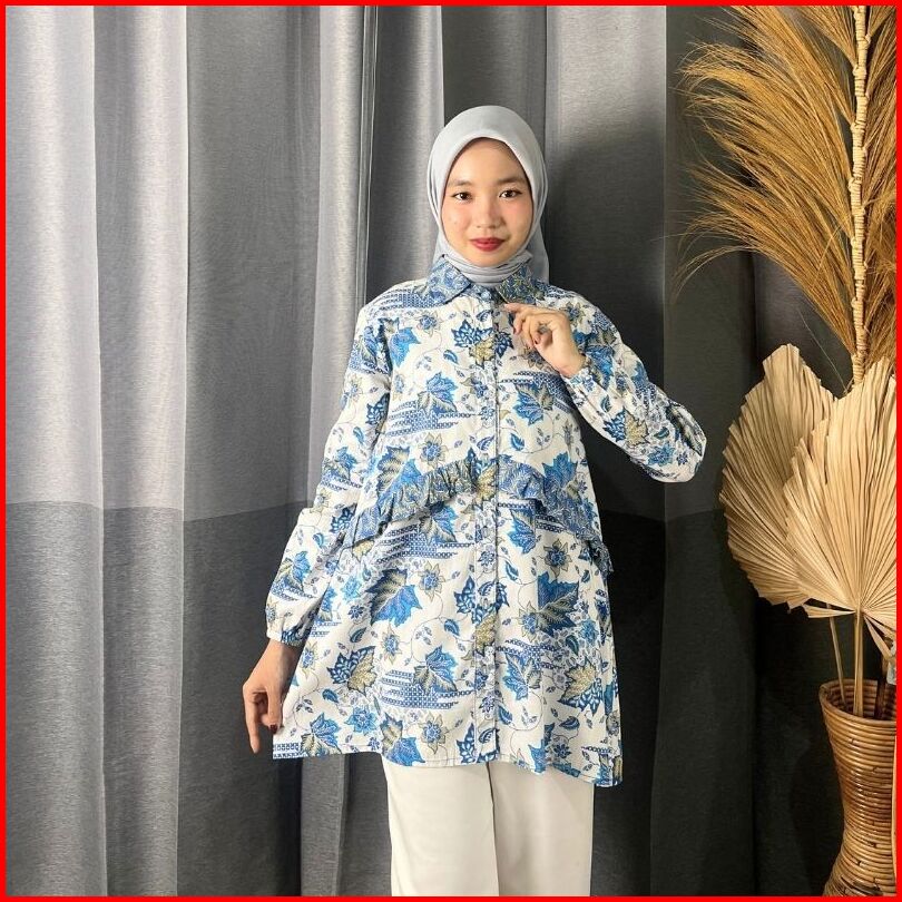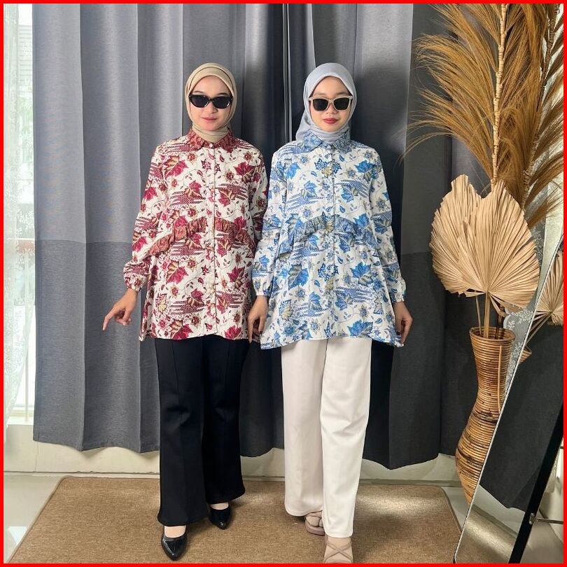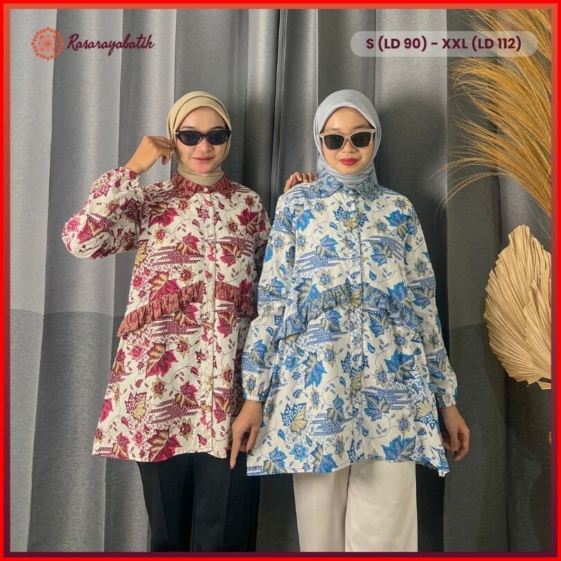 Rasaraya Batik Kalista Kemeja Wanita Katun - Atasan Batik Kerja Kantor Formal Merah Biru