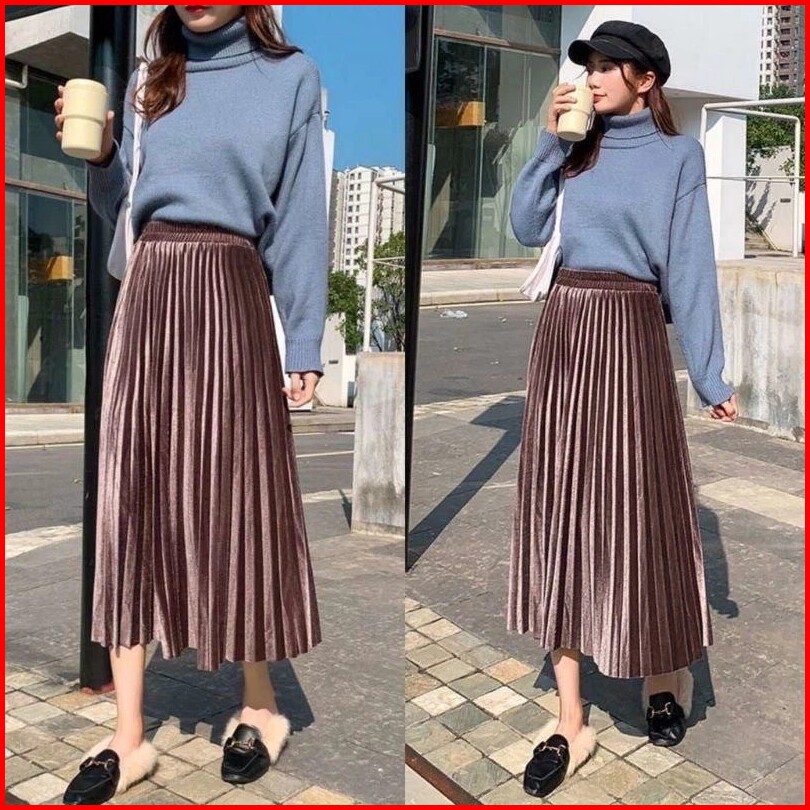 Threelook - Rok Bludru Plisket Premium 7 8 Bulu Velvet Maxmara Import Model Remaja Kekinian Terbaru Korea Style