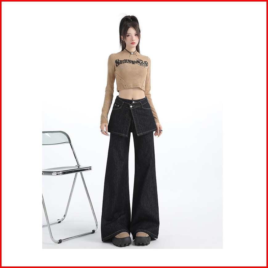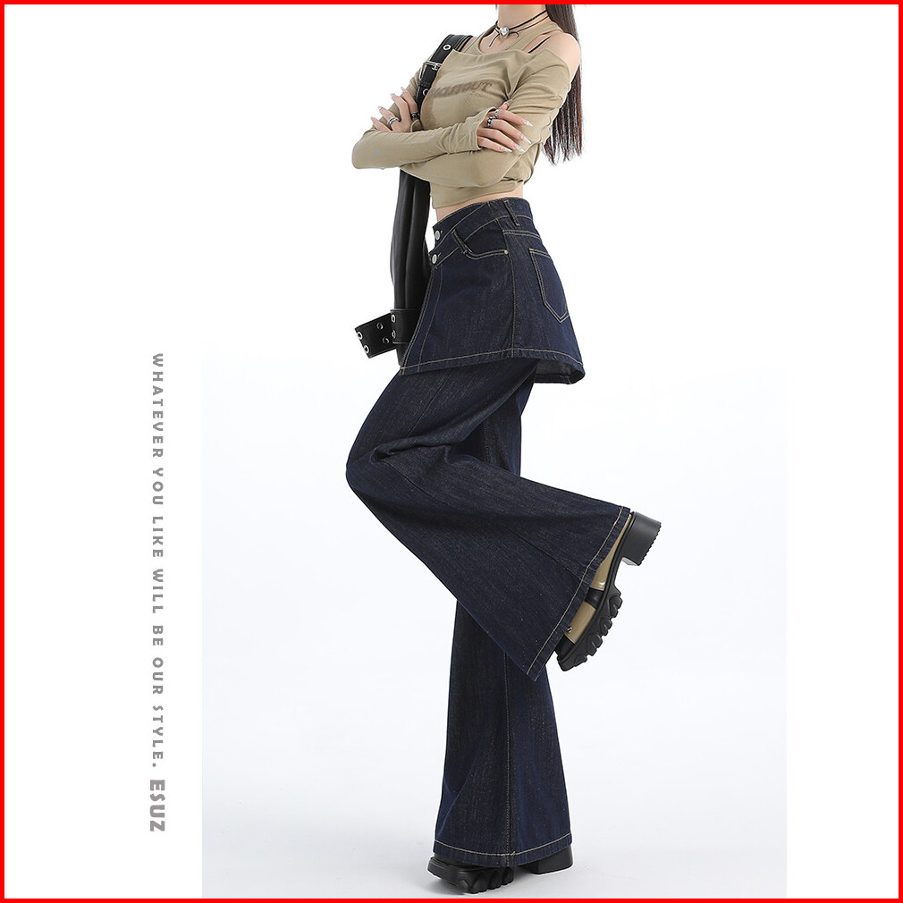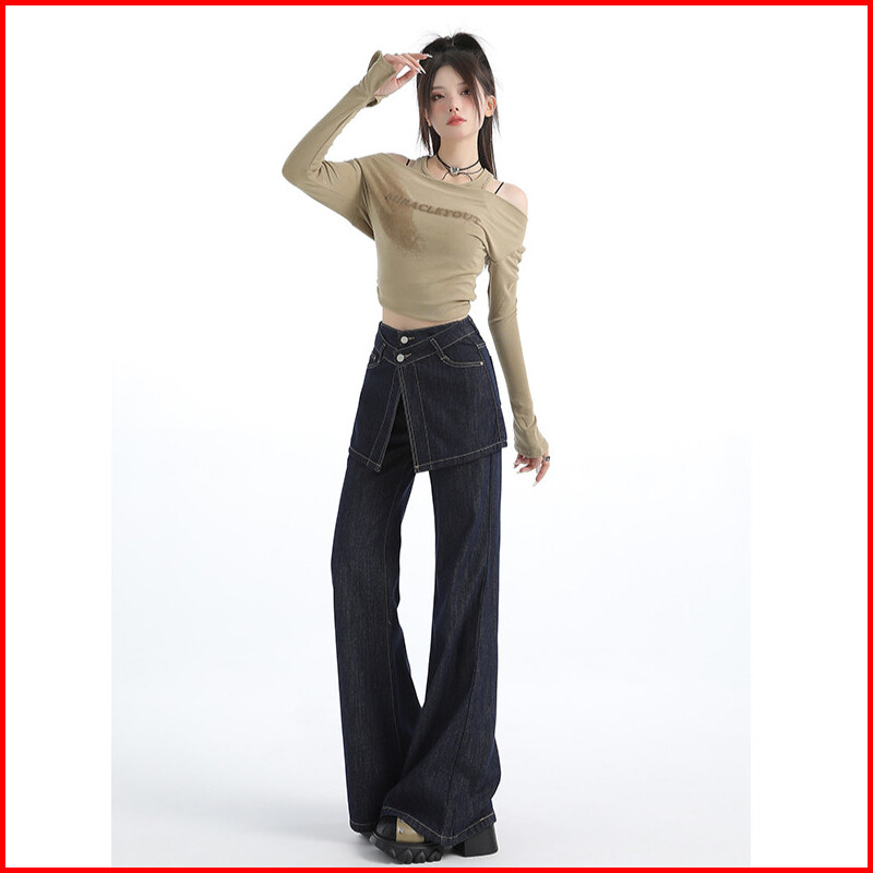 Nana Jeans Biru Tua Wanita Baru Berpinggang Tinggi Dan Desain Tipis Celana Melebar Kaki Lebar 054