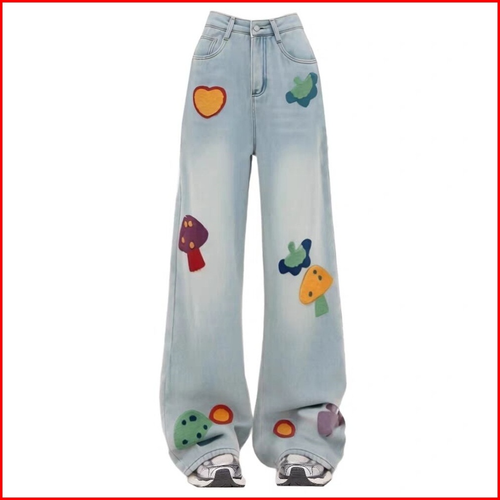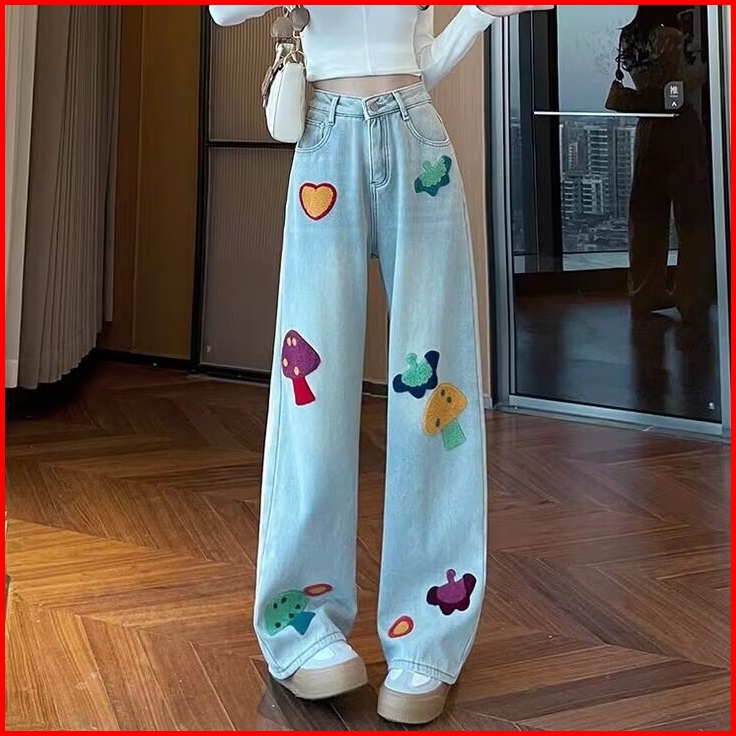 Katermen Jeans Wanita Gaya Korea Bordir Celana Jeans Kaki Lebar Pinggang Tinggi Celana Lurus Ramping