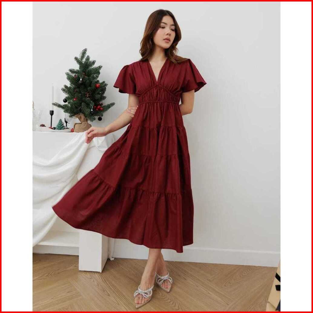 Megan Midi Dress Wanita Rok Susun Leher V Tangan Pendek Korean Style Bahan Rayon Twill