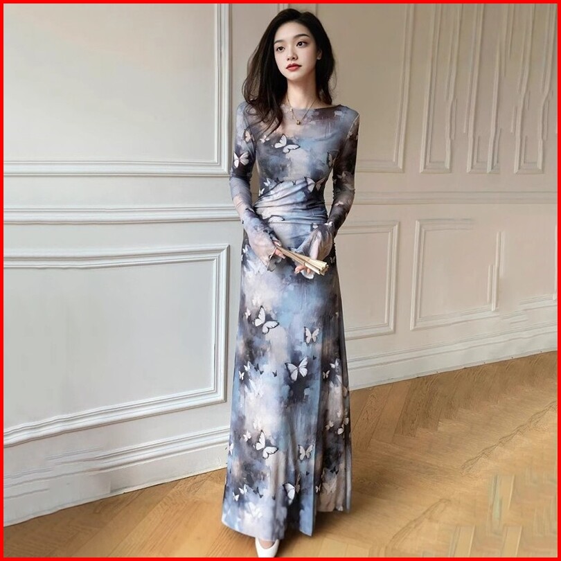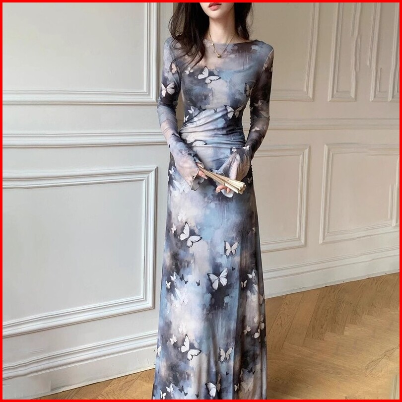 Newlan Qz196 Gaun Mesh Pinggang Ramping Motif Kupu Kupu Gaun Bunga Floral Long Dress Press Body Lengan Panjang Vintage W