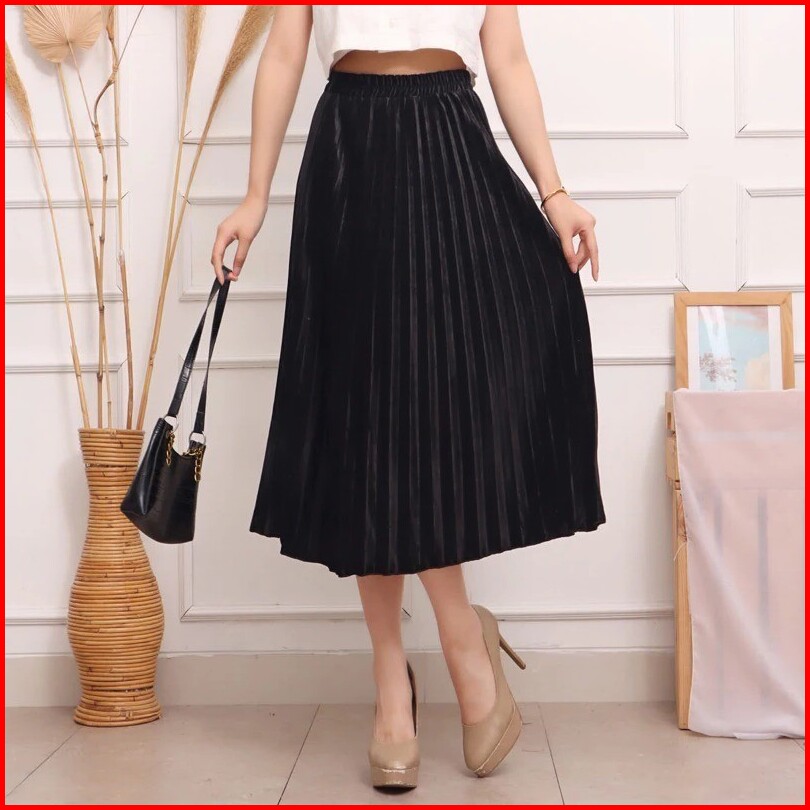 Threelook - Rok Plisket Bludru Velvet Premium 7 8 Model Terbaru Korea Style Remaja Kekinian Warna Hitam Cokelat Dustypin