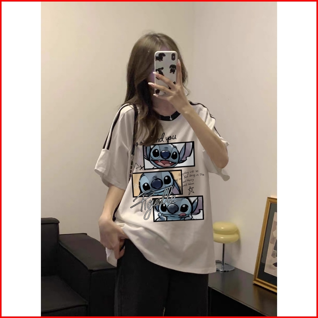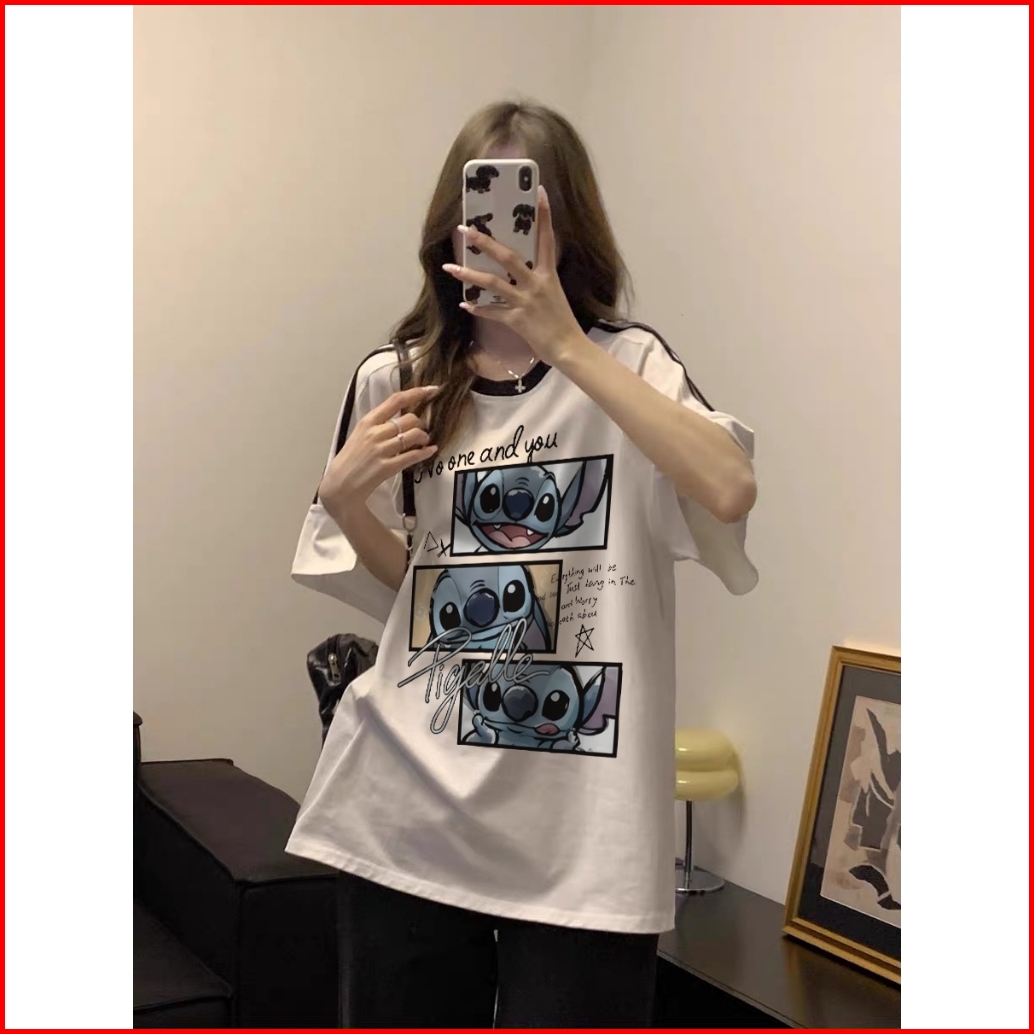 The Monseur Gallery Tali Bahu T-shirt Oversize Kartun Lucu Stitch Style Kaos Wanita Tali Bahu Hitam