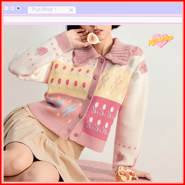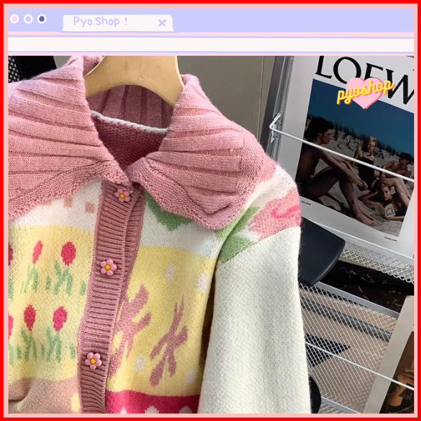 Pyoshop - Cardigan Wanita Flower Knit Kerah Lucu