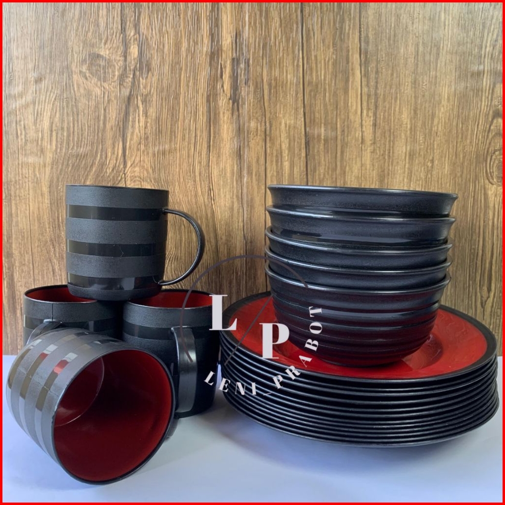 Paket Mangkuk Ramen 6 12 Pcs Set Piring Gelas Mangkuk Estetik Hitam Merah Elegan Untuk Rumah Usaha