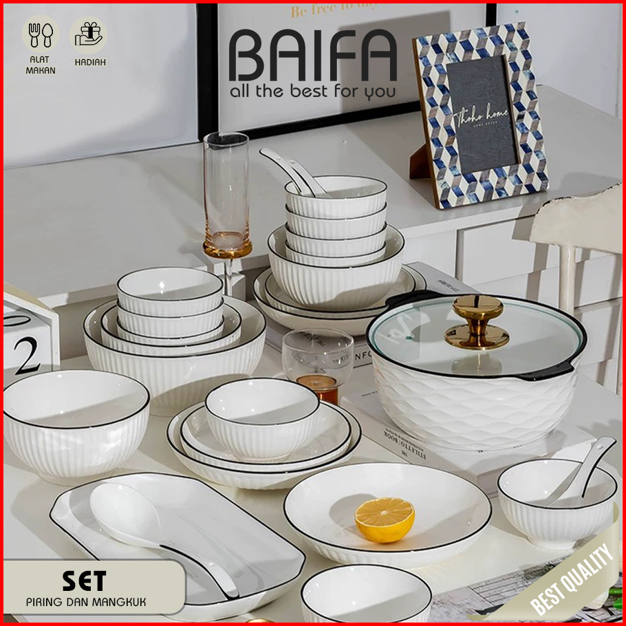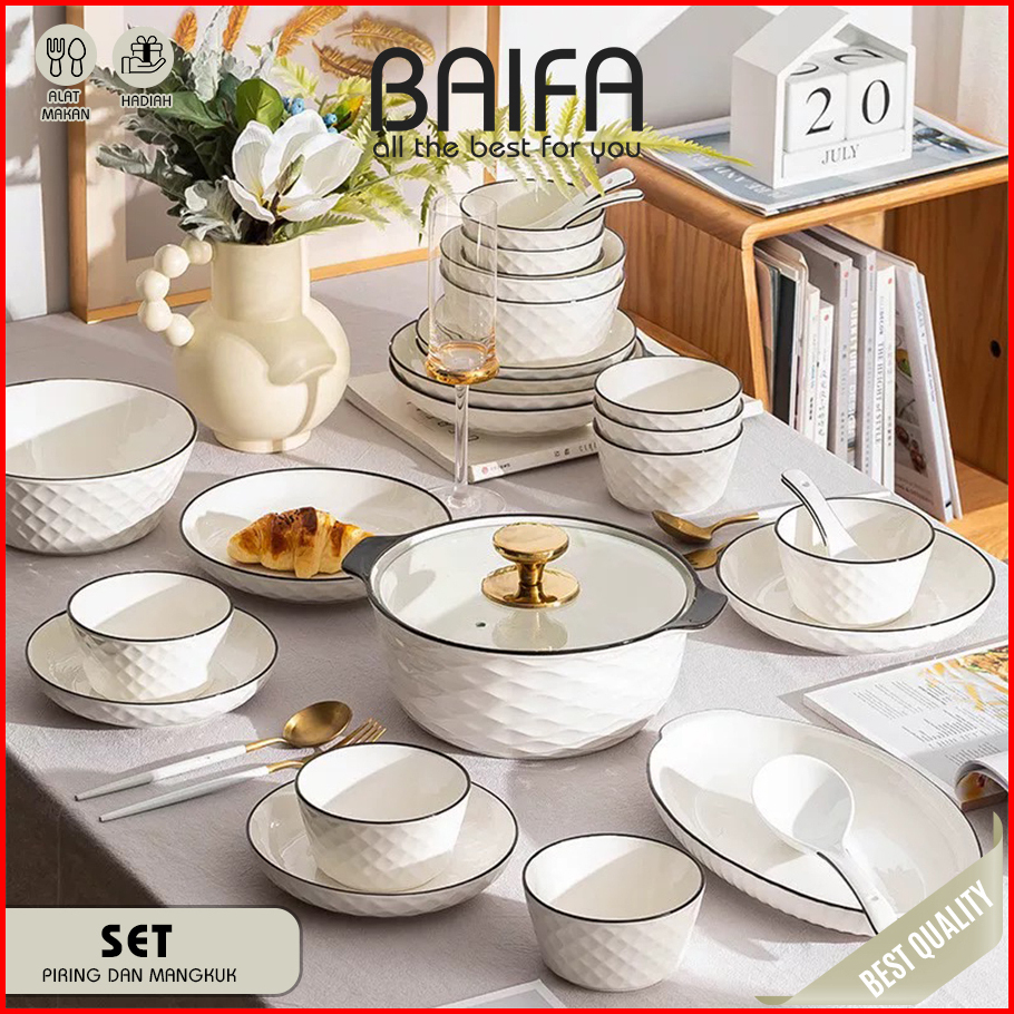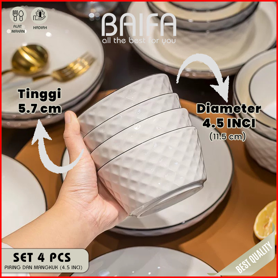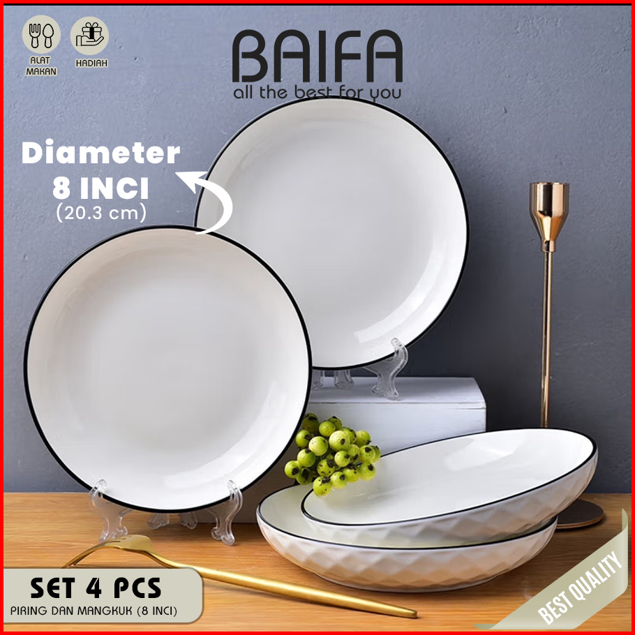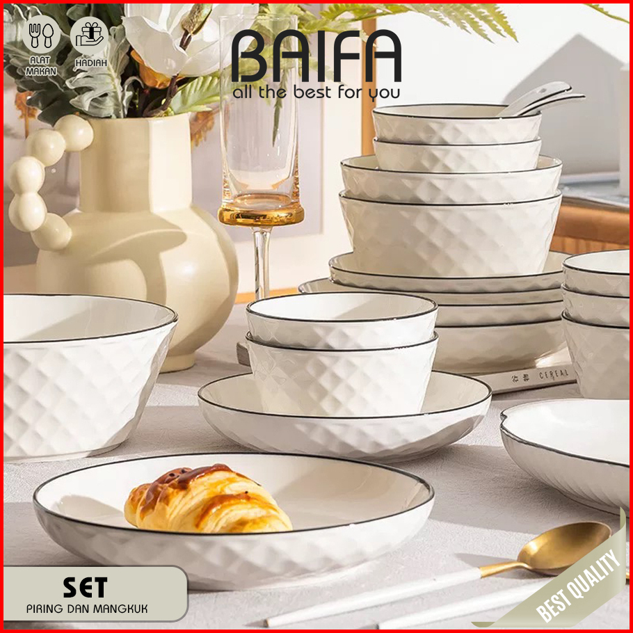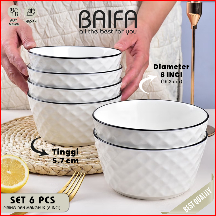Baifa - Set 6 Piring Mangkuk Makan Keramik Putih List Hitam Elegant Piring Dinner Plate Style Diamond Pattern