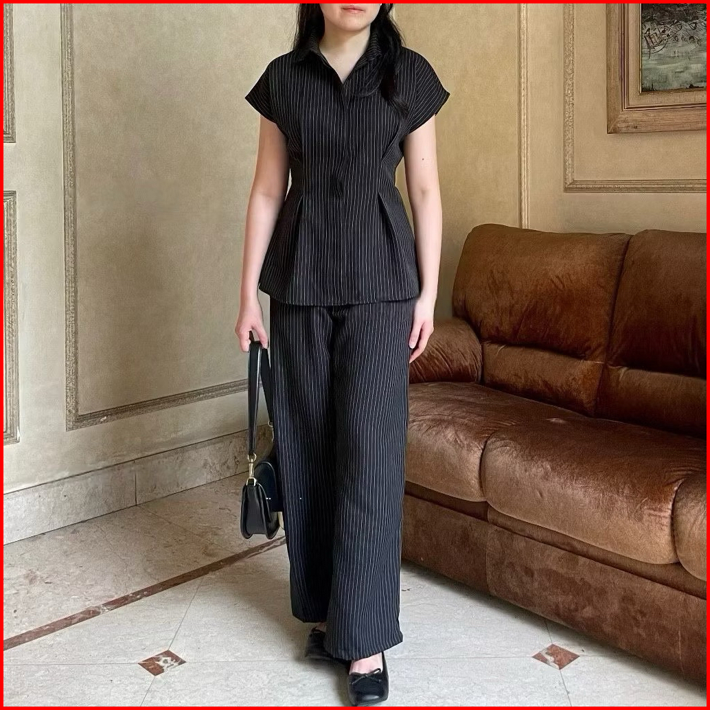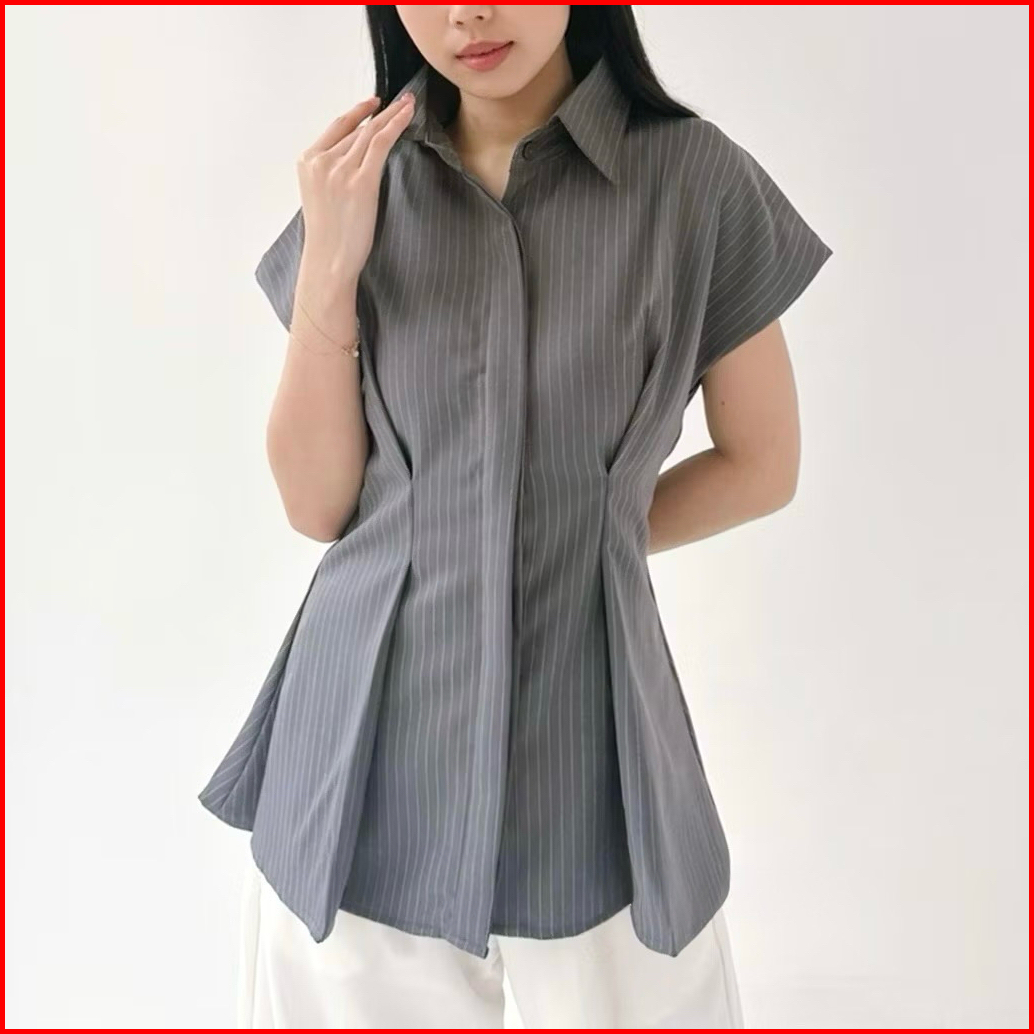 Kemeja Wanita Salur Alba Top Stripe Fitted Shirt Slim Fit Lengan Pendek Casual Kantor Korean Style